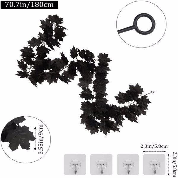 package list:2 * 5.9 feet/piece artificial maple leaf garlands4 * hooks12 * Bat stickers12 *Spider stickers[Artificial Garlands'Package]- 2 pieces of 5.9 feet/piece artificial maple leaf garlands(Black), total length: 11.8 feet, plus 4 hooks to hanging. The package also contains two packs of 3D stickers, so you can dress up your room as you like[Artificial Foliage Garland]- These maple leaves are made of delicate silk cloth, and the branches drape effortlessly since they are made of high-quality and flexible plastic. We add vein on the foliage to make it look like the real fallen leaves, and leaves don't come off when you are arranging them, durable and vivid[Hanging Fall Maple Leaf Garland]- The maple leaf garland is an ideal choice for balcony ,garden,indoor,outdoor,restaurants,office. As a hanging fake plant,it can also decorate home clearance,balcony,table,door,swing stand,stair banisters, and fireplace many more. Great decorations for Indoor and outdoor[Multiple Matching Methods]- It easy to connect multiple strands to create a long garland you need or cut the vine into a shorter garland. Hether you only need 6 feet for the mantel, 12 feet are draping over a doorframe, or 24 feet for the stair railings, this garland has you covered[Simple to Use]- Compared with real flowers, our artificial plants do not require careful maintenance. You only need to simply place the artificial plants on the table or hang them on the door to achieve the decorative effect. After using the product, the product can be cleaned up and stored in a sealed packaging bag. This will save you a lot of time