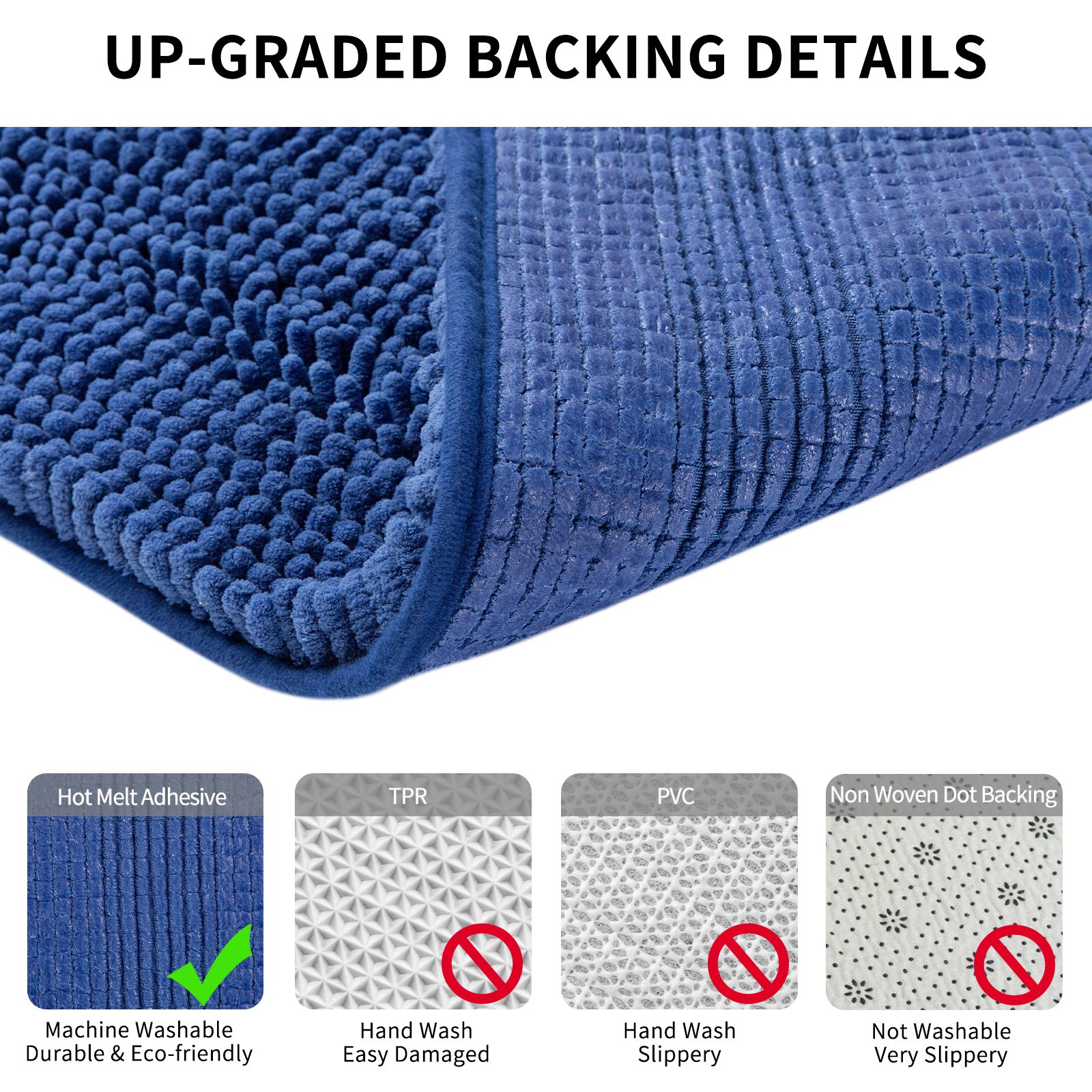 ULTRA THICK SOFT-100%Made of thick and velvety microfiber chenille.The thick and soft chenille floor mat makes your feet feel the ultimate luxury enjoyment.When you step on it after a bath; it will be as comfortable as stepping on a cloud