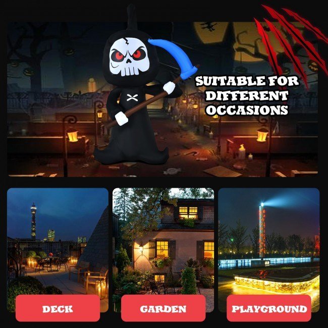 5.Perfect Halloween Decoration: This 6 Ft tall inflatable ghost is holding a scythe in hand like a real ghost and its exquisite patterns also make it more realistic. You can place it indoors and outdoors on Halloween to add scary atmosphere.
