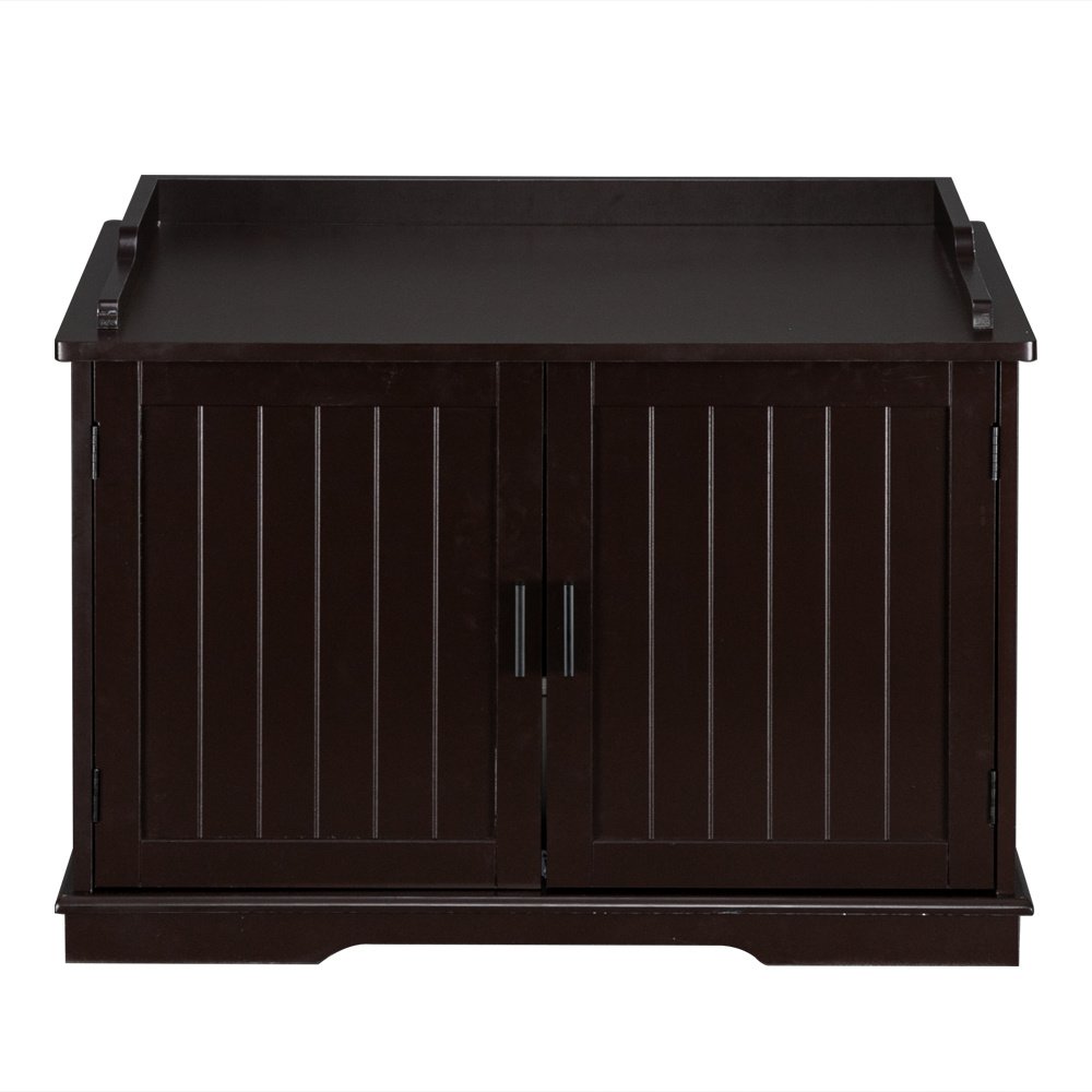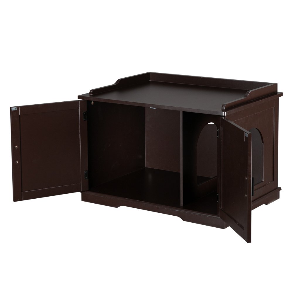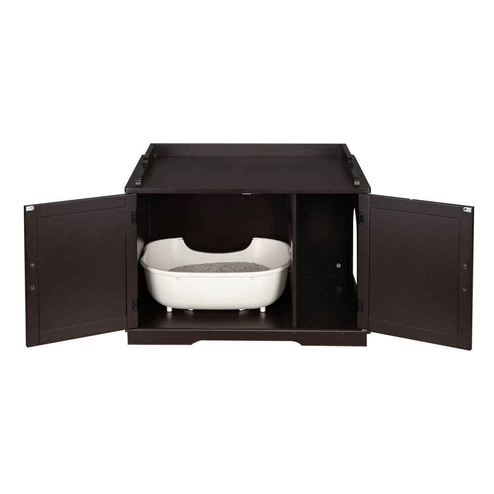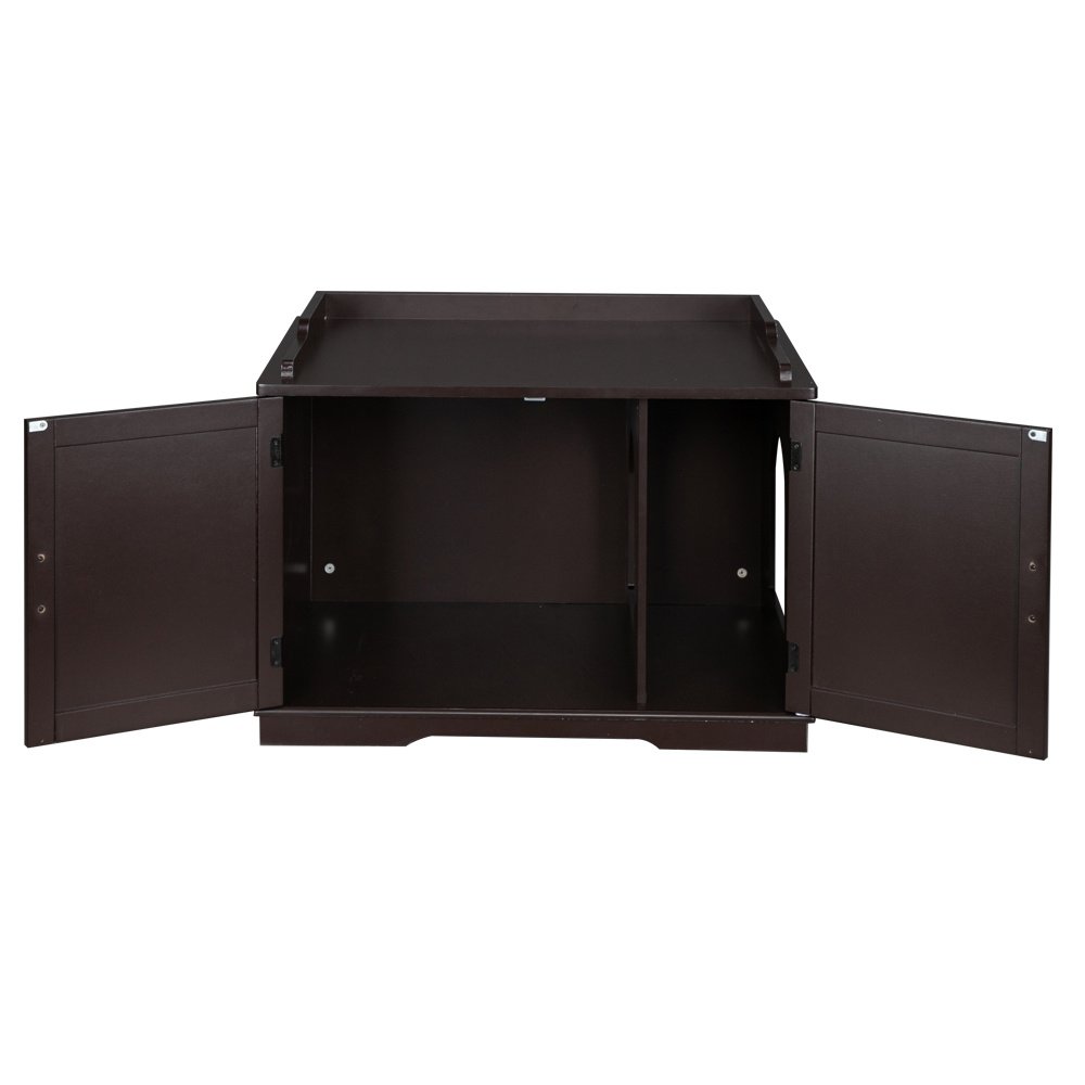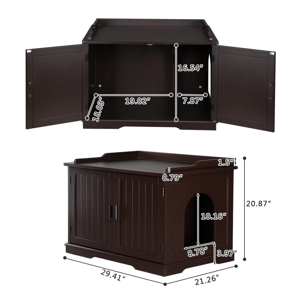 Introductions:MULTIFUNCTIONAL FURNITURE: In the entrance and exit as a shoe-changing stool; as a side table beside the sofa in the living room; as a nightstand in the bedroom;and always have a place to store your litter box!PET ACCESSIBLE: A small entryway is built into the side of the cabinet with an internal divider; give your pet easy and instant access to their litter box while the divider reduces the spread of loose litter by creating an extra barrierHIDES YOUR LITTER BOX: Maintain a tasteful and tidy living space as this enclosure accommodates most litter box sizes and reduces the spread of offending odors; simply remove the divider to fit larger litter boxesSTRAIGHTFORWARD SETUP AND EASY CLEANUP: Have this kitty enclosure assembled in about an hour with all the tools you need included. Take advantage of the magnetic cabinet doors for easy access to the litter box and quick cleanupFeatures:1. Solid and durable board, with great quality2. Easy installationSpecifications:1. Material: E1 MDF Board2. Color: Brown3. Dimensions: (33.85 x 21 x 20.8)" / (86 x 53.5 x 53)cm (L x W x H)Package Includes:1 x Litter Box Enclosure1 x English User's Manual