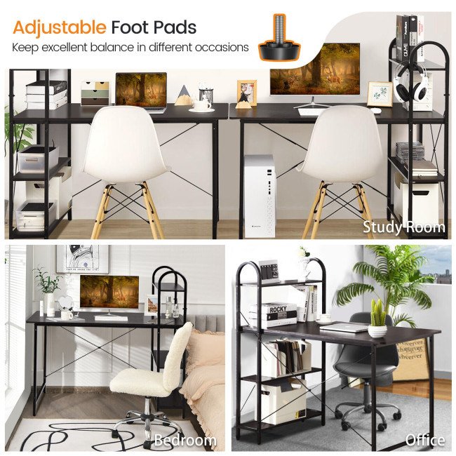 Especially with the reversible bookshelf, the study writing desk can fit in a left or right corner to suit your working habits. Also, the 4-tier side shelf provides adequate space for books, office supplies and sundries. Meanwhile, a 48" x 23.5" desktop is an ideal place for a computer, keyboard and documents while you still have sufficient working space. As for its stability, it is supported by baked painted steel and fitted with adjustable foot pads. Both ensure that the 48" x 23.5" x 45.5" computer desk will keep in stable all the time. Finally, assembly is so easy that it only takes you a little time.