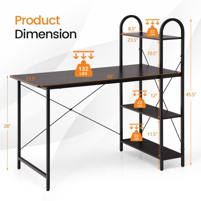 2.Good Storage Creator: The study writing desk comes with a 4-tier side shelf keeping your books, stationery and office supplies within reach. More, 48" x 23.5" is very spacious. Except for the roomy working area, it also accommodates the computer, keyboard and other desk accessories.