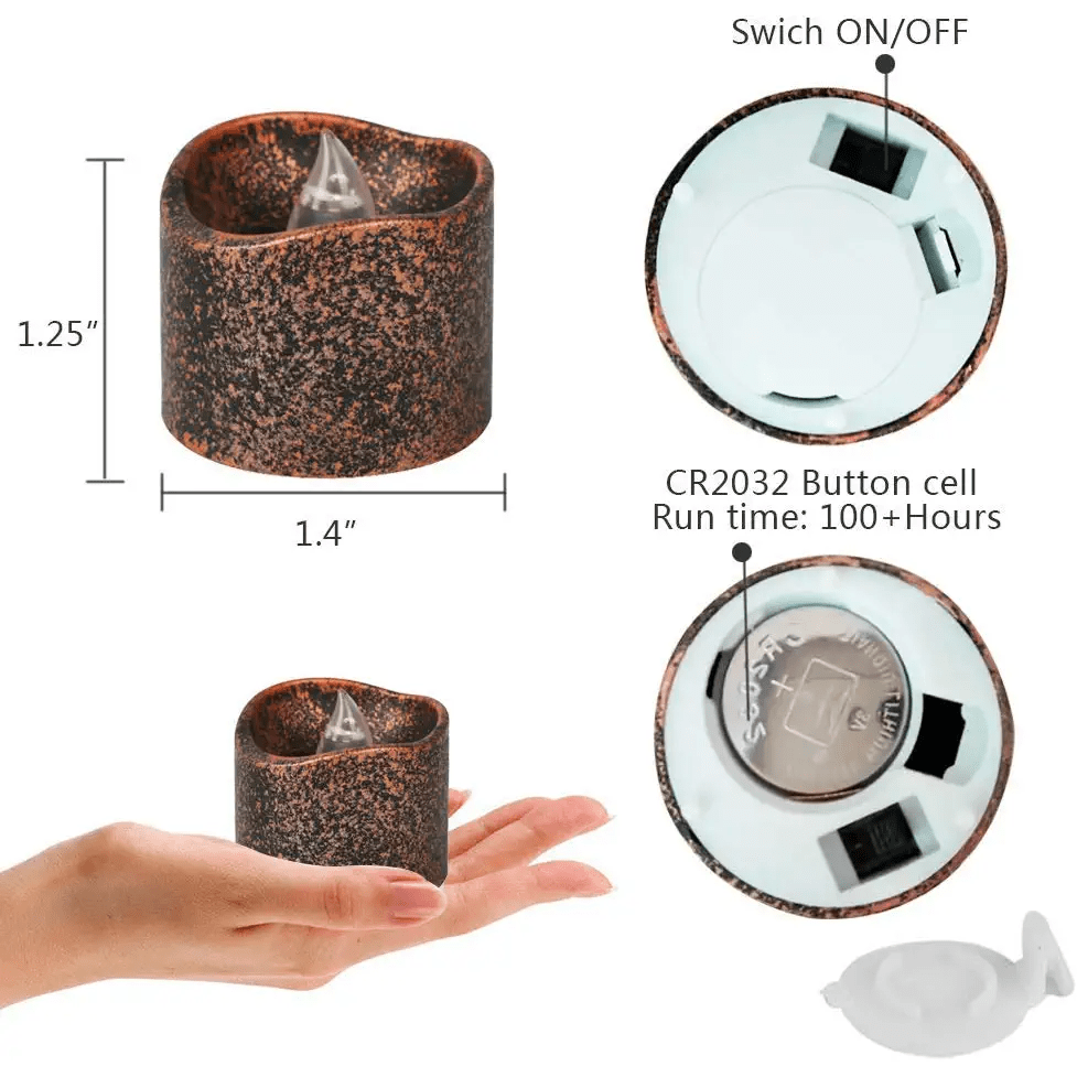 <br>ENJOYMENT & RELAXATION - A realistic soft flickering white glow emanates from the black shell of these small fake candles, forming a special sight for enjoyment and relaxation. More wonderfully, you can sense a touch of metallic texture from the unscented copper spotted surface of these flameless flickering candles.