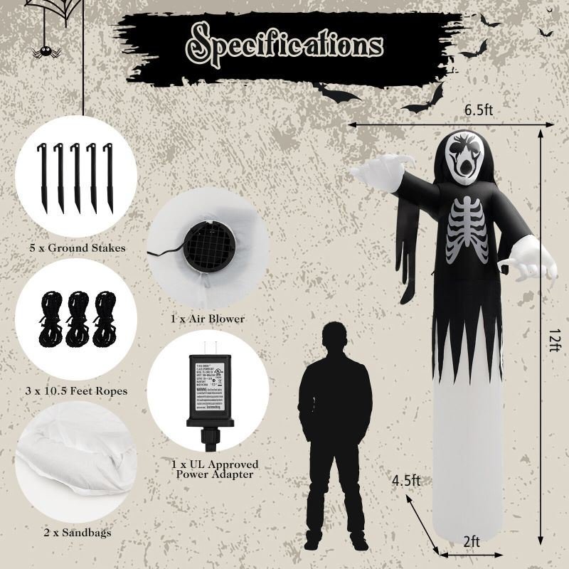 5.Comes with built-in sandbag, ground stakes and ropes for higher stability. Suitable for Halloween party, yard, lawn, front porch, and haunted house, etc
