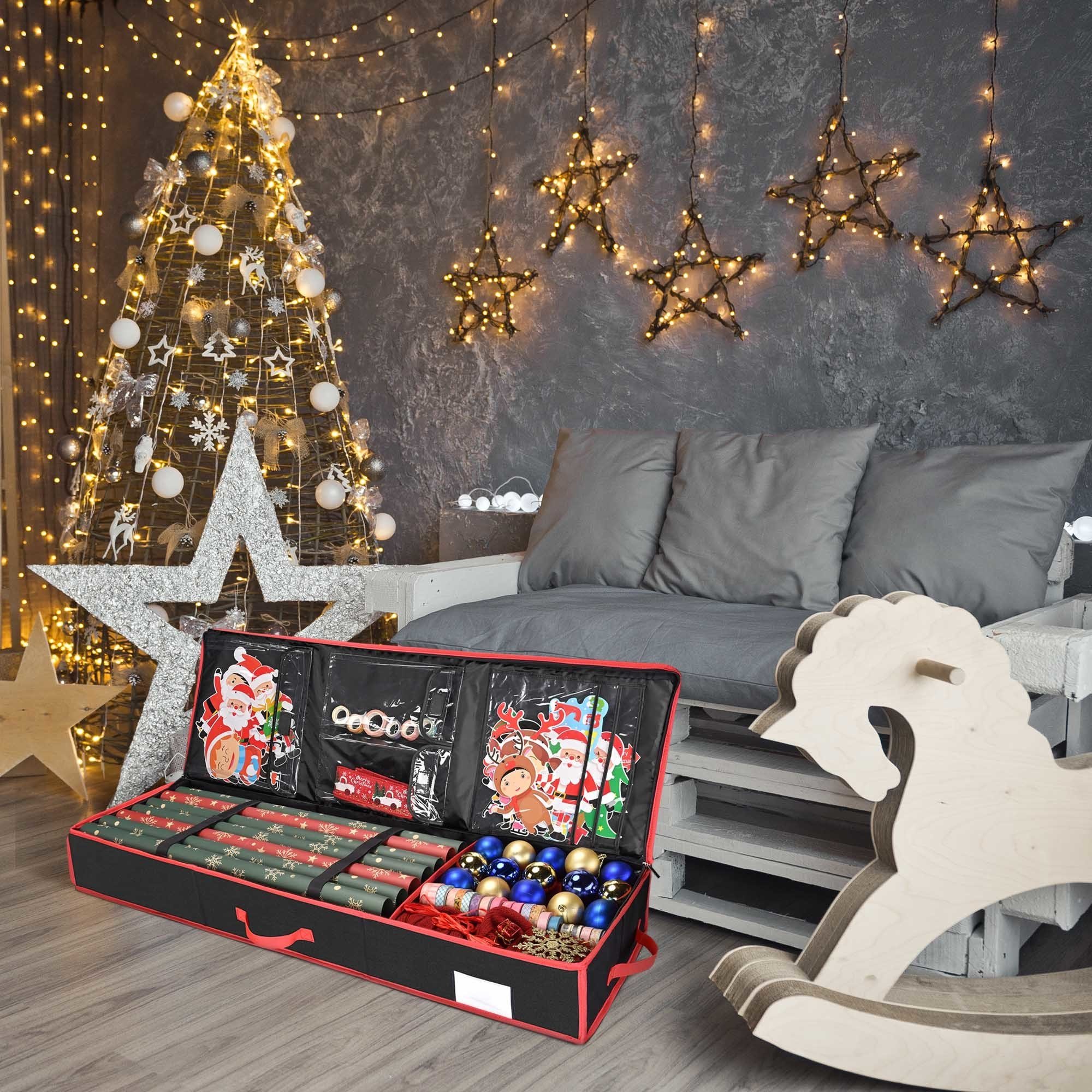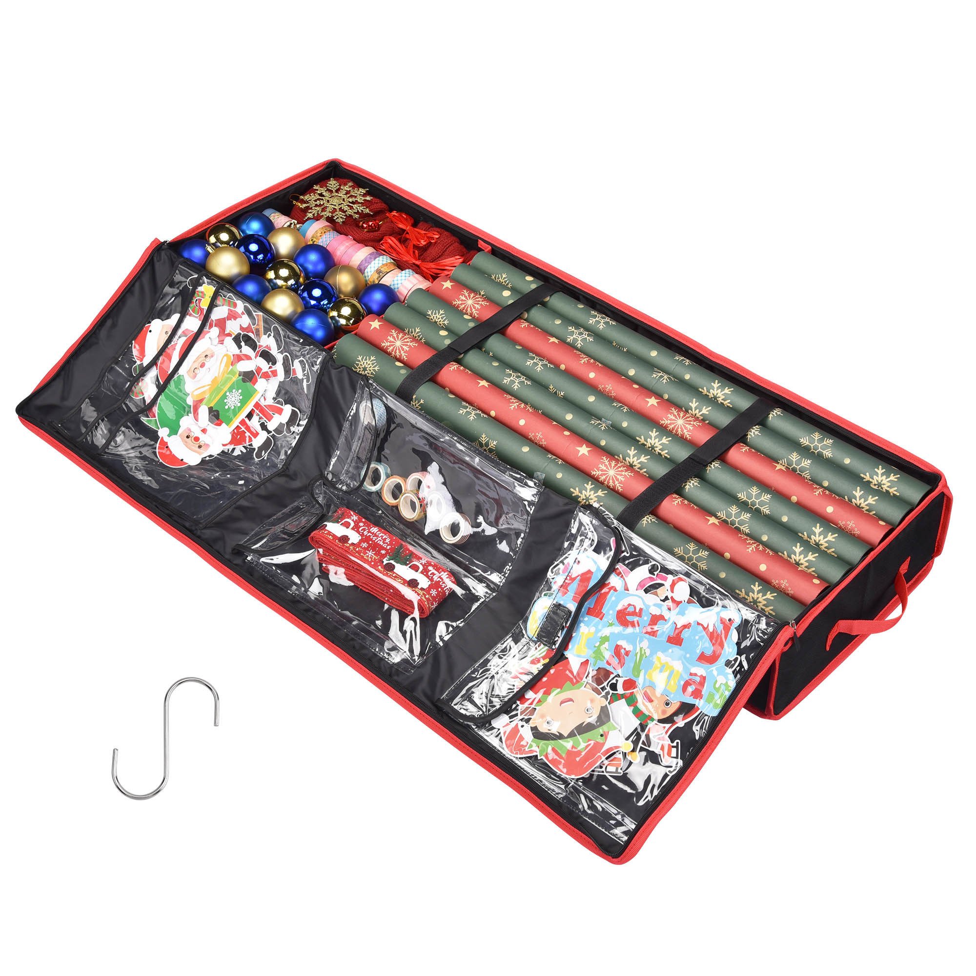 - Large Capacity - 41"x13"x5" Christmas Wrapping Paper Storage Bag comes with adjustable divider to fit items of different shape; keep multiple long gift paper rolls neat and organized; 3 transparent slots & 3 pockets under the lid for added storage space to place extra items like bows; labels; tape; scissors