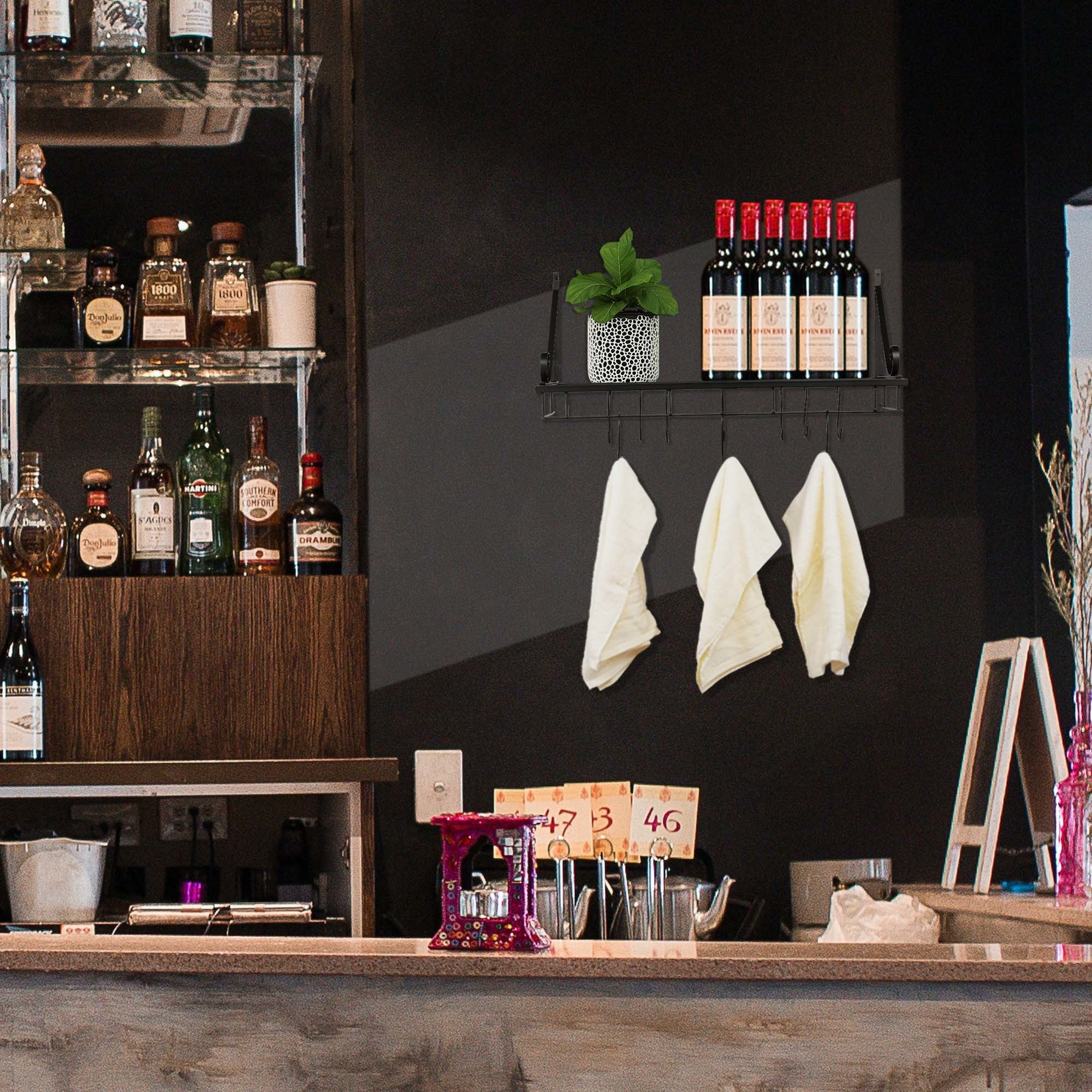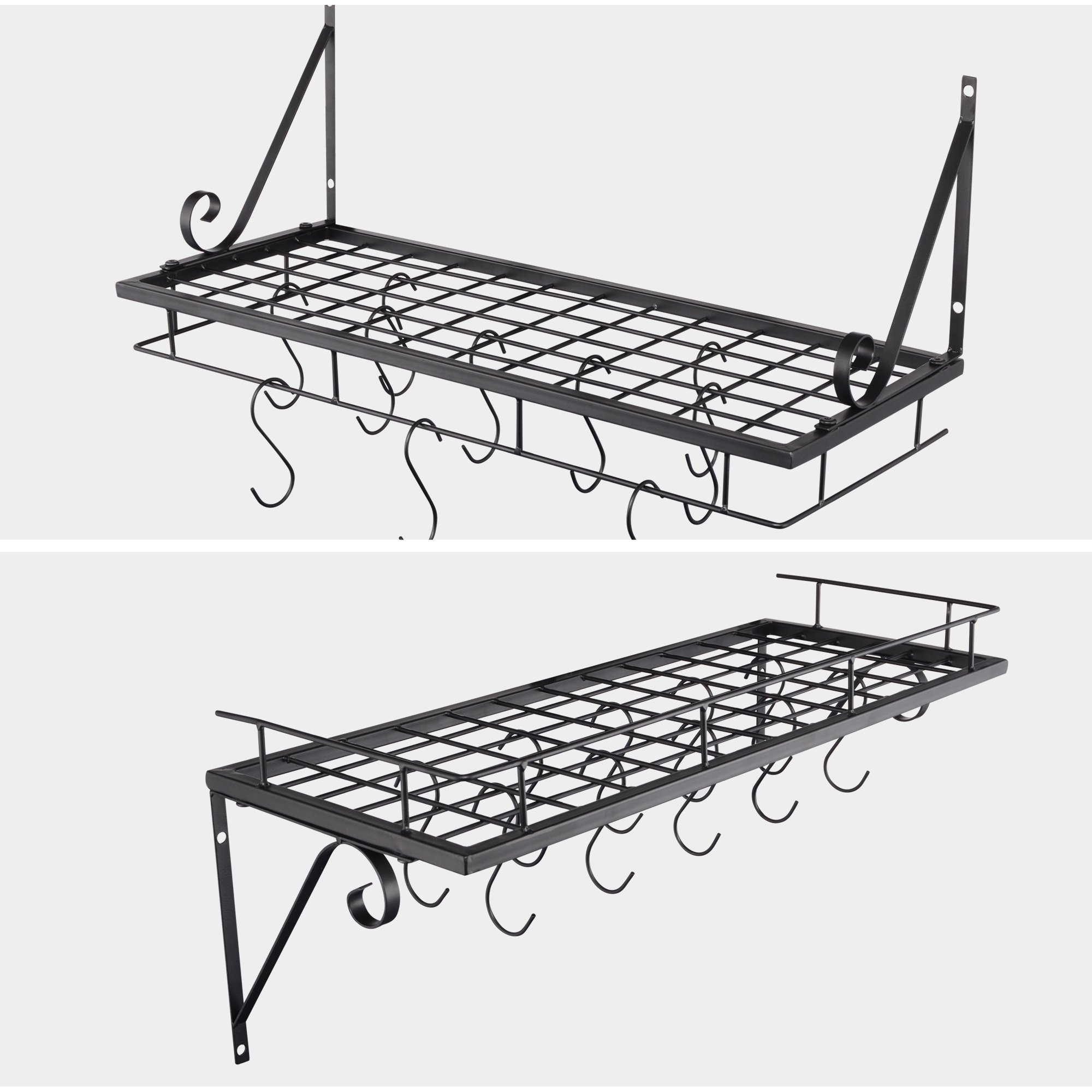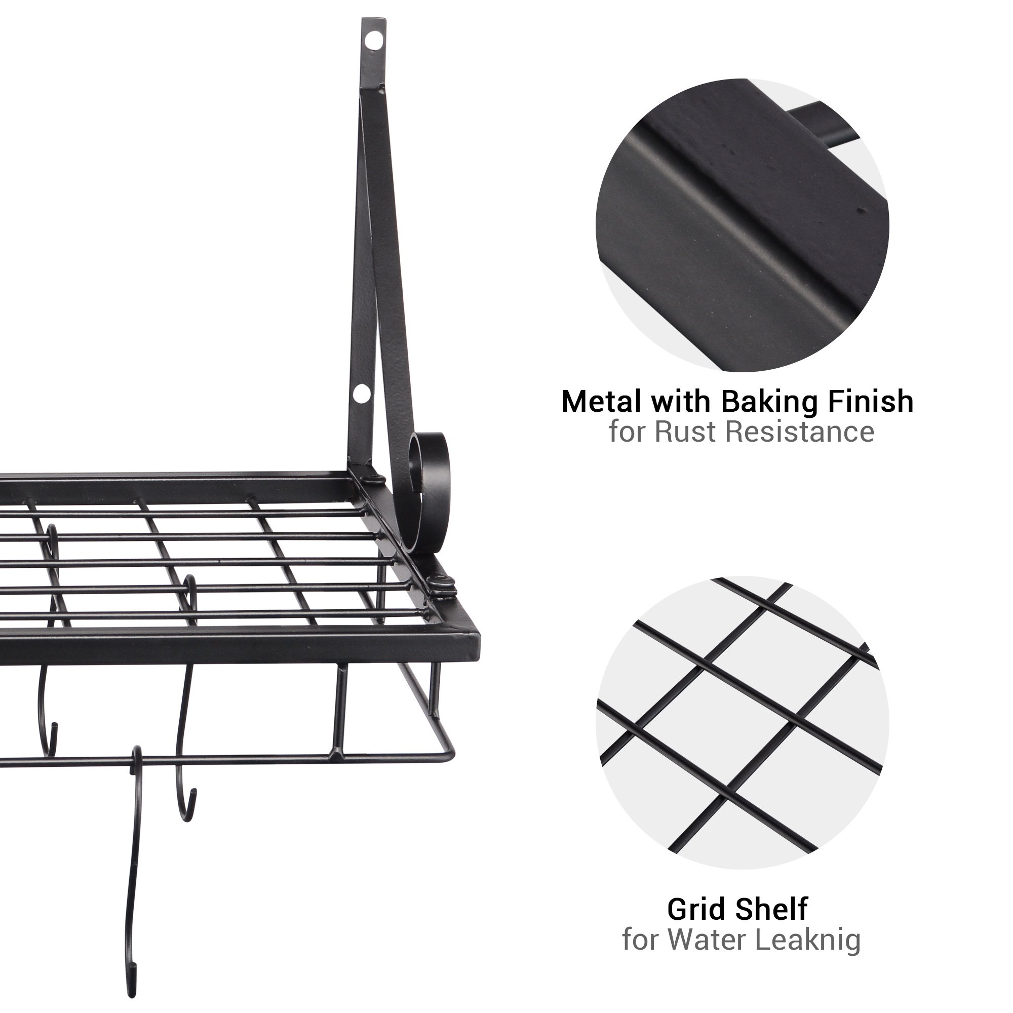 - Versatile Storage - Aquaterior Wall Mount Cookware Rack features 25"x10" large storage shelf for holding pan & pot; keeping large amount of cookware organized and tidy; also great for putting plants at balcony; books in reading room; toiletries in bathroom; 10 removable hooks provide extra storage for hanging towel; spoon and so on
