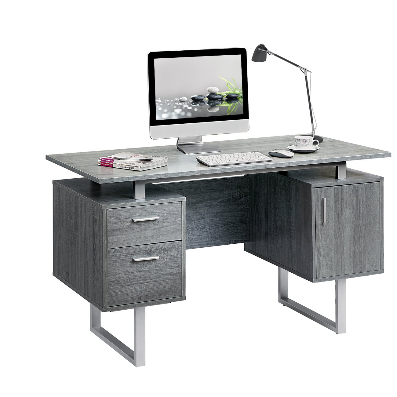 LONG DESCRIPTION : Techni Mobili Cubism is sleek and contemporary; this desk is the perfect combination of function; durability and design in a modern form. With clean lines; a floating top work station and sleek track metal legs; this desk will add pizzazz to any home office. Featuring two storage drawers and a file cabinet to help keep you organized with a large desktop surface to provide plenty of room for all your hardware and working needs. Color: Grey