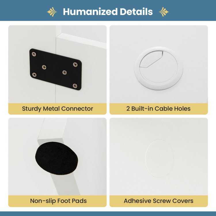 4.Easy Assembly & Humanized Details: Detailed instruction and labeled parts are provided for easy assembly. And there are many functional accessories. For example, the 2 cable grommets fitted in the reserved holes on the tabletop can get the wires in order, while the adhesive screw covers hide the unsightly holes for a clean look.