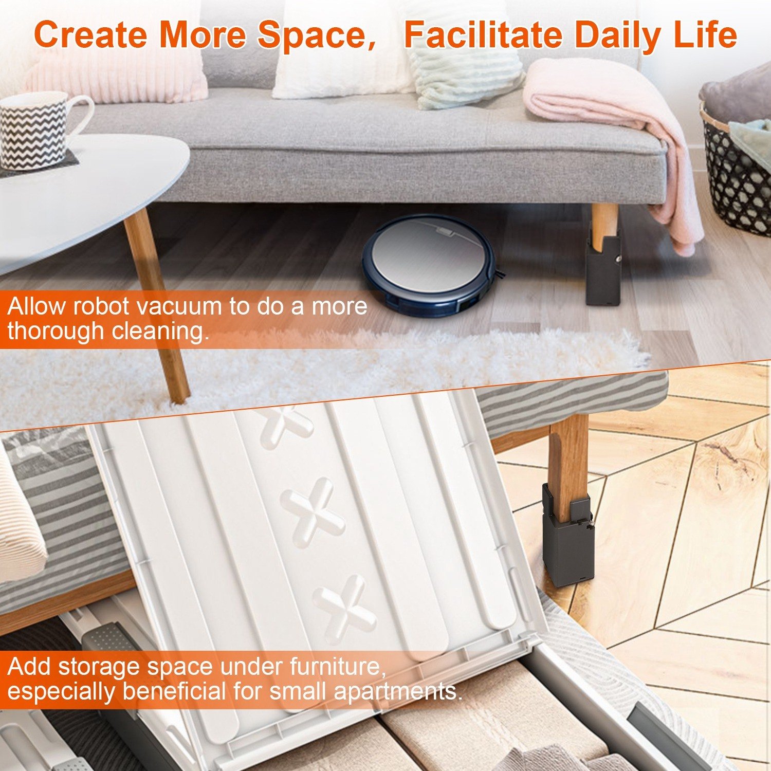 *Create More Space*:Adding additional height not only creates more storage space but also allows vacuum cleaners to do a more thorough cleaning. You can apply the risers to bed; couch; armchair; table; and sofa to reduce shoulder pain or neck pain caused by low height of furniture.