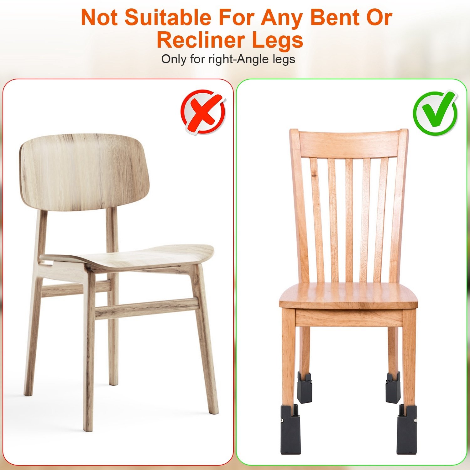 *Adjustable Width*:Fit for round or square legs with a diameter between 1in and 2in. Increased height:4in. Heightened groove protection:1.2in. Warm Tips:Not for bent or recliner chairs; only for right angle chairs.