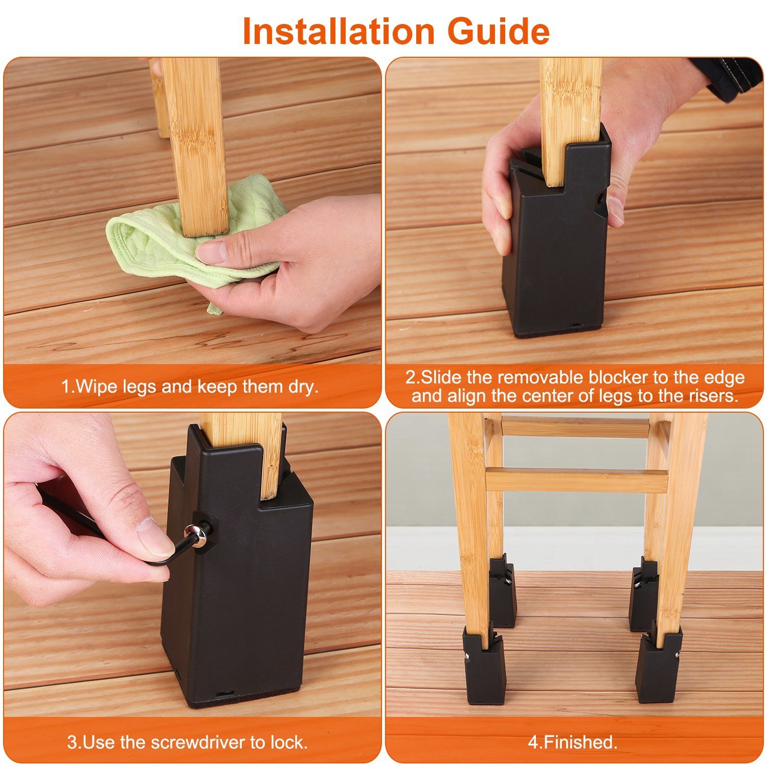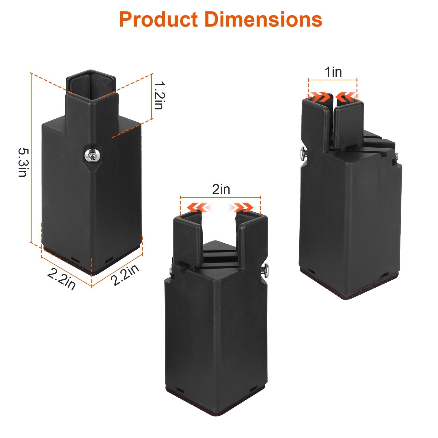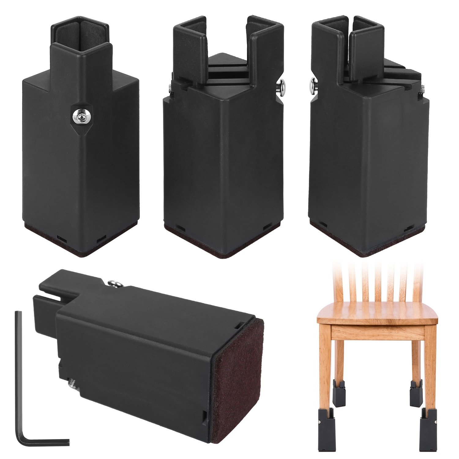 *No Falling Off*:Compared with those risers that are easy to fall off; our risers feature adjustable screw clamp fixture and 1.2in groove sinking; which ensures a snug fit and avoids tilting when moved or lifted. These risers will always remain intact by wrapping the furniture legs securely.