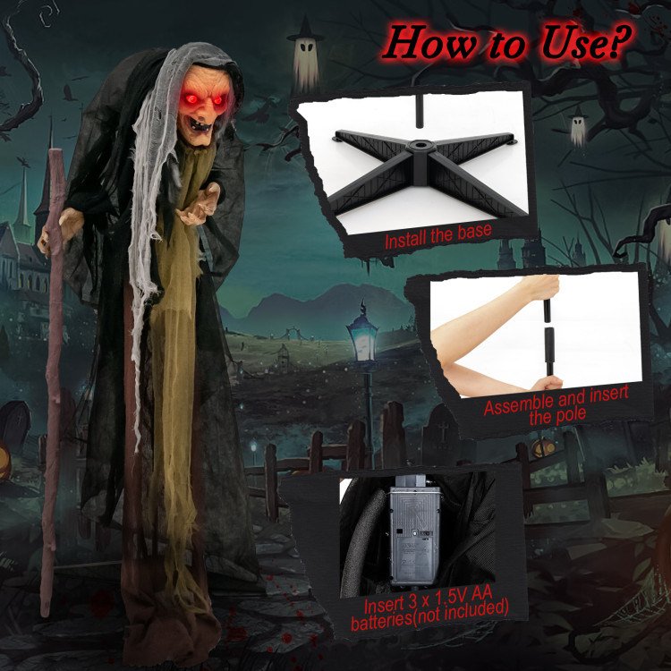 1.Super Scary Halloween Prop: The animated standing witch wears shabby clothes, features horrible face with long and pointed sunken chin, and posable arms, adding a scary theme to Halloween party. Look! Her flashing red eyes are staring at you, as she threatens those who approach her.