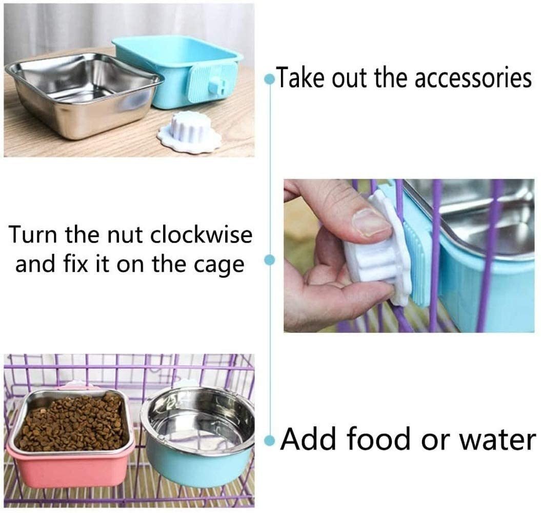 2.This dog feeding bowl attach directly to the cage for easy feeding. Or you can use it as a basic bowl. There is a plastic fixed bowl and metal bowl in one set, you can also separate them into two bowls.