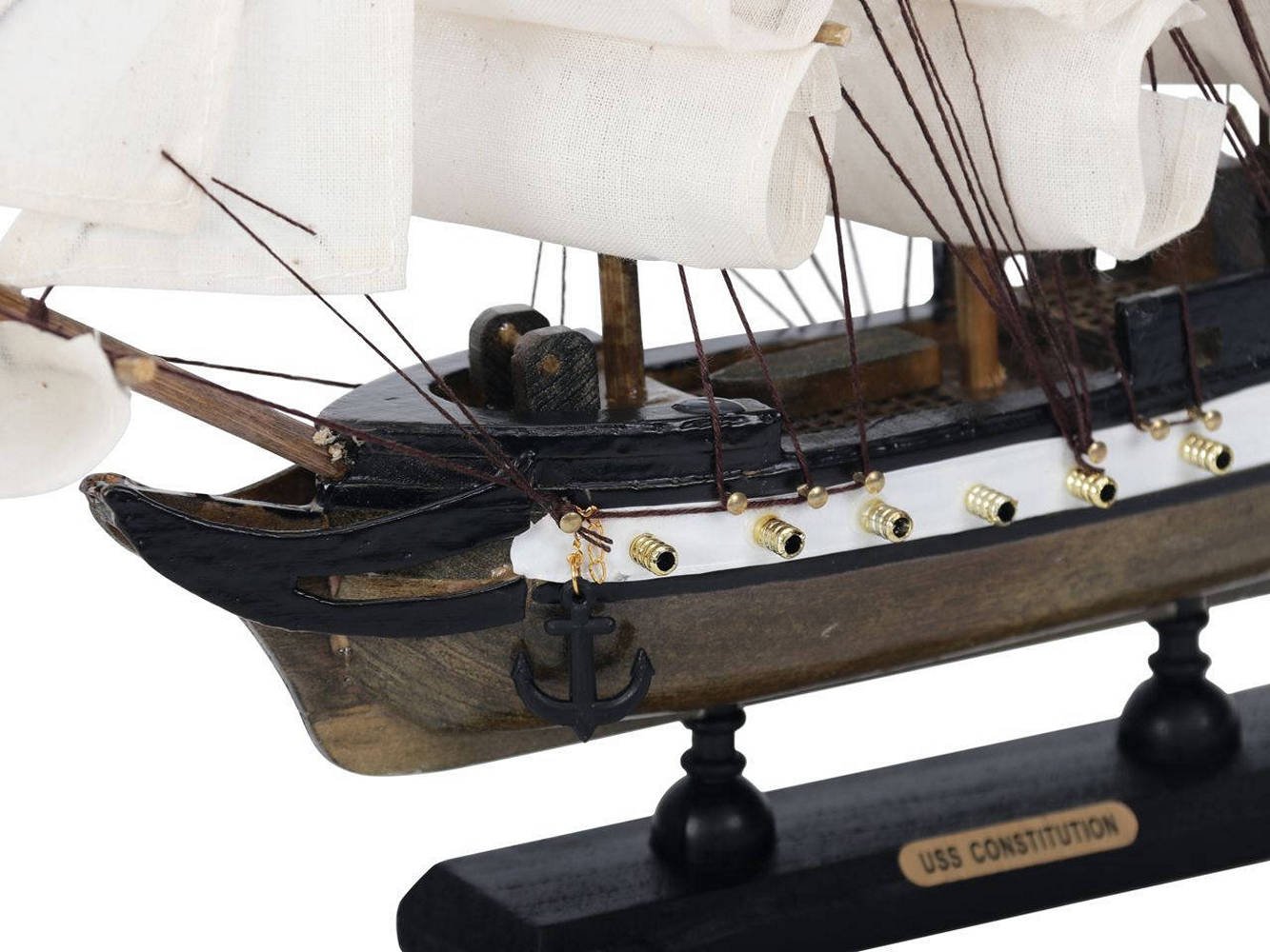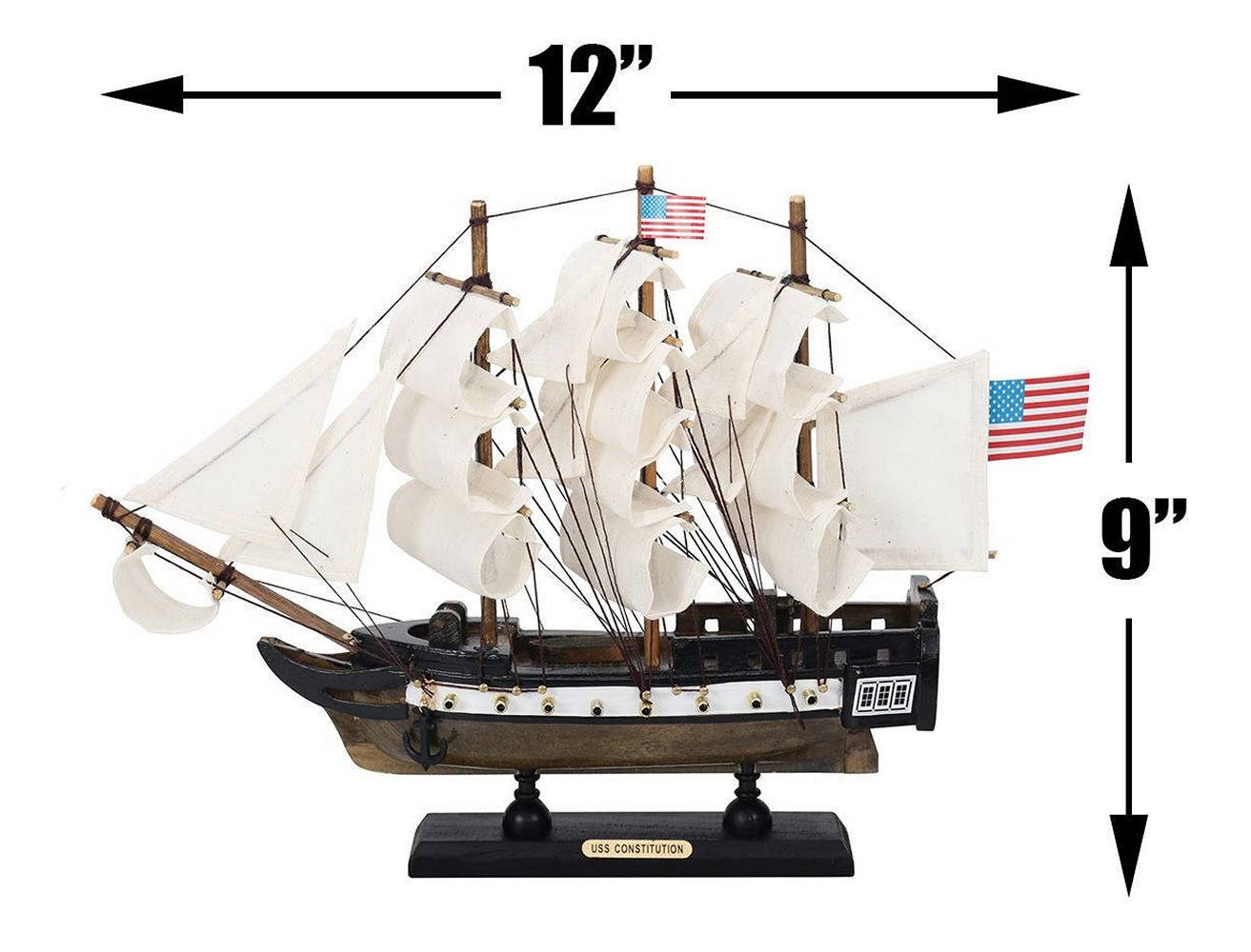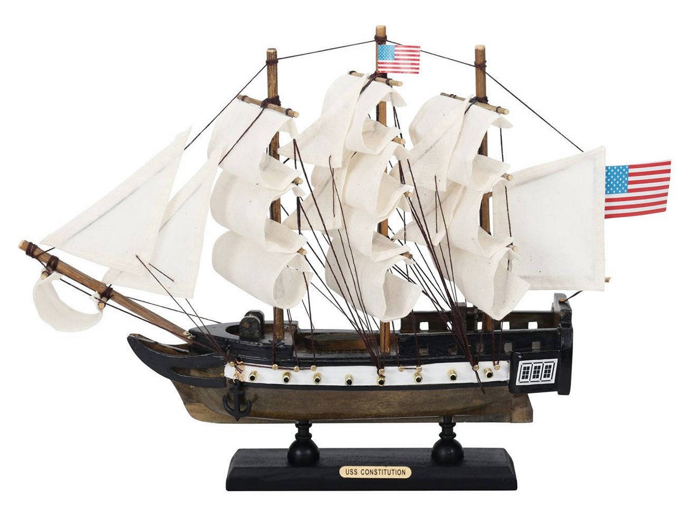 • Wooden display base prominently displays the nameplate: USS Constitution