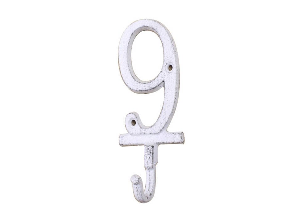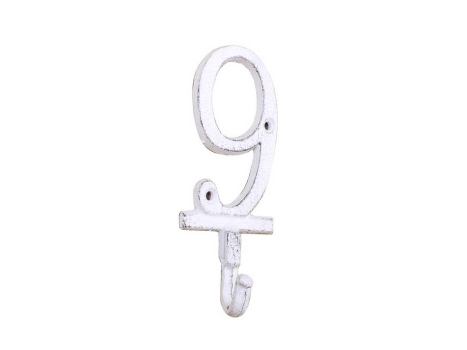 Whitewashed Cast Iron Number 9 Wall Hook 6""