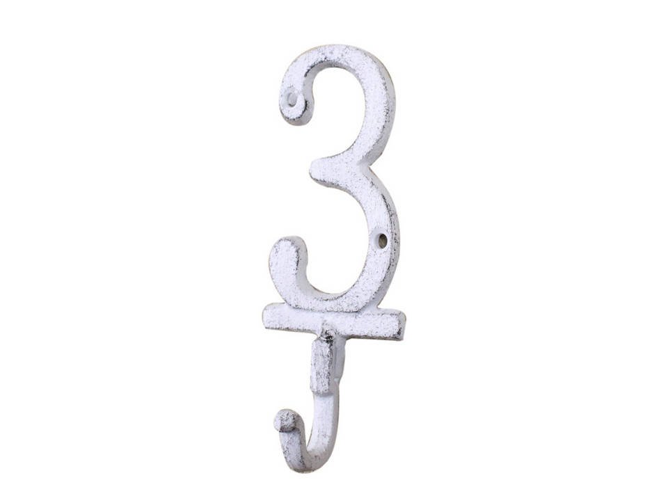Add a rustic touch to any empty wall or door with this decorative Whitewashed Cast Iron Number 3 Wall Hook 6". Handcrafted from cast iron by our master artisans, this sturdy wall hook is ideal for hanging coats, hats, purses, scarves, and keys. This stylish cast iron wall hook is a great addition to any home or office and the versatility of this number hook will showcase your creativity to anyone who visits. Easily mountable, this hook can be mounted on any wall of your bedroom, hallway, kitchen, bathroom, outdoor patio, or any area that may benefit from a hint of rustic decor. Proudly display this rustic cast iron number hook and bring an antique elegance to your home or office.