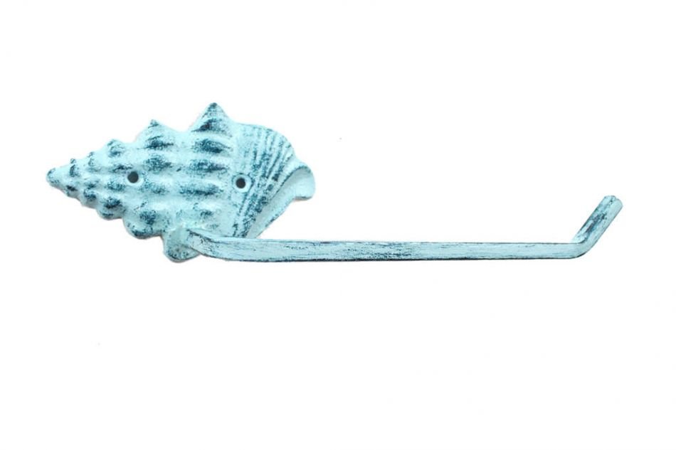 Home > Rustic Dark Blue Whitewashed Cast Iron Conch Shell Toilet Paper Holder 11""