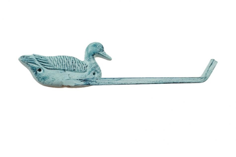 This Rustic Dark Blue Whitewashed Cast Iron Mallard Duck Toilet Paper Holder 10" is perfect for any nautical inspired bathroom or kitchen. It adds charm to any nautical room, while impressing your guests with their substance and thoughtfulness. Ideal for hanging toilet paper, this durable toilet paper holder 10" is crafted from cast iron. Easily mountable, display this decorative holder to show those who visit your home the affinity for the sea-faring lifestyle.