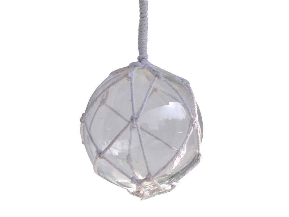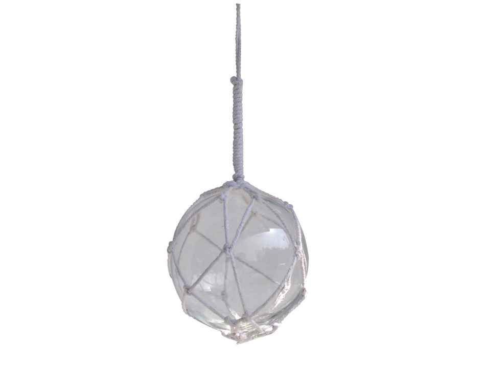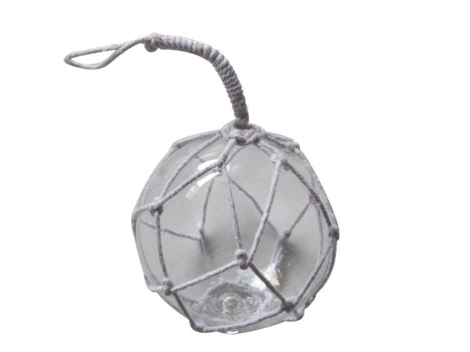 This Clear Japanese Glass Ball with White Netting Christmas Ornament 4" is a perfect piece of beach wall art. Gorgeous decor on your Christmas tree, enjoy the charming inner warmth of this buoy float as lights play through the glass ball. Perfectly contrasting the glass float is the authentic fishing rope netting which holds the float in place. This float ornament decoration will light up any tree and adds the final nautical touch your Christmas needs. This charming float ornament can be easily hung onto any Christmas Tree.