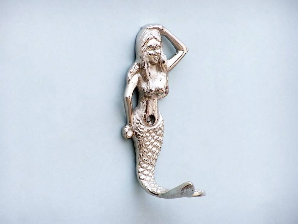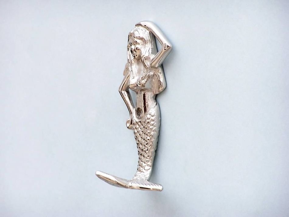 This Chrome Mermaid Hook 6" is the perfect addition for any nautical themed home. Handcrafted from aluminum, this hook allows for easy decorative mounting, ideal for hanging clothes and accessories. Display this decorative hook to add a nautical theme to any room and show those who visit your home your affinity for the nautical sea-faring lifestyle.