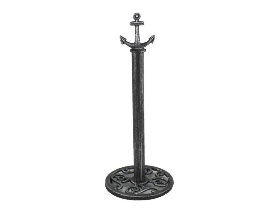 This Antique Silver Cast Iron Anchor Extra Toilet Paper Stand"  is perfect for any nautical inspired bathroom. It adds that nautical touch to enhance your nautical bathroom decor. Made to hold three extra toilet paper rolls, this durable toilet paper stand 16" is crafted from cast iron.