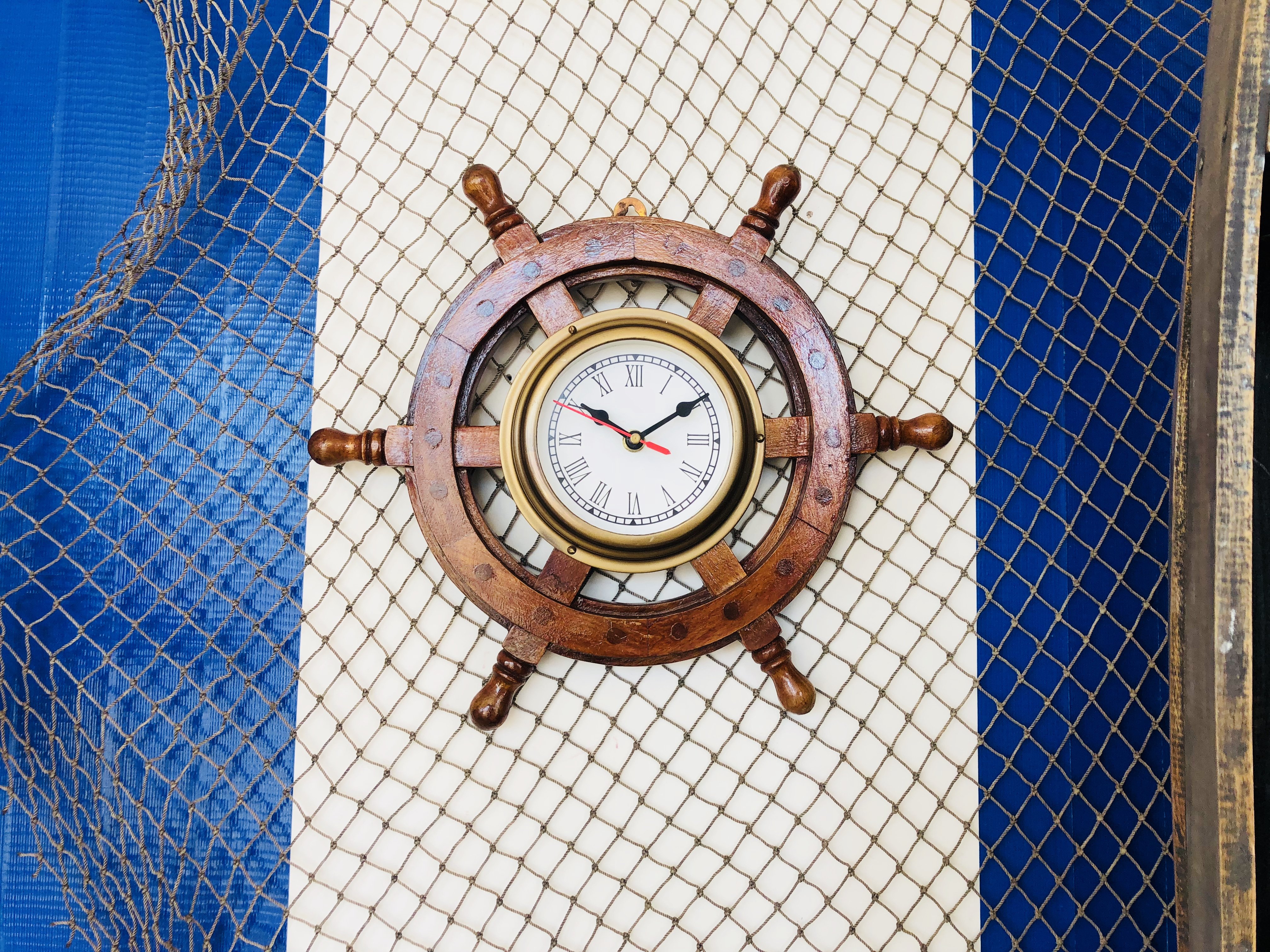 In addition, the center of the wheel is solid brass and includes a real, working clock. The clock is approximately 5-inches in diameter and rests perfectly inside the ship wheel.