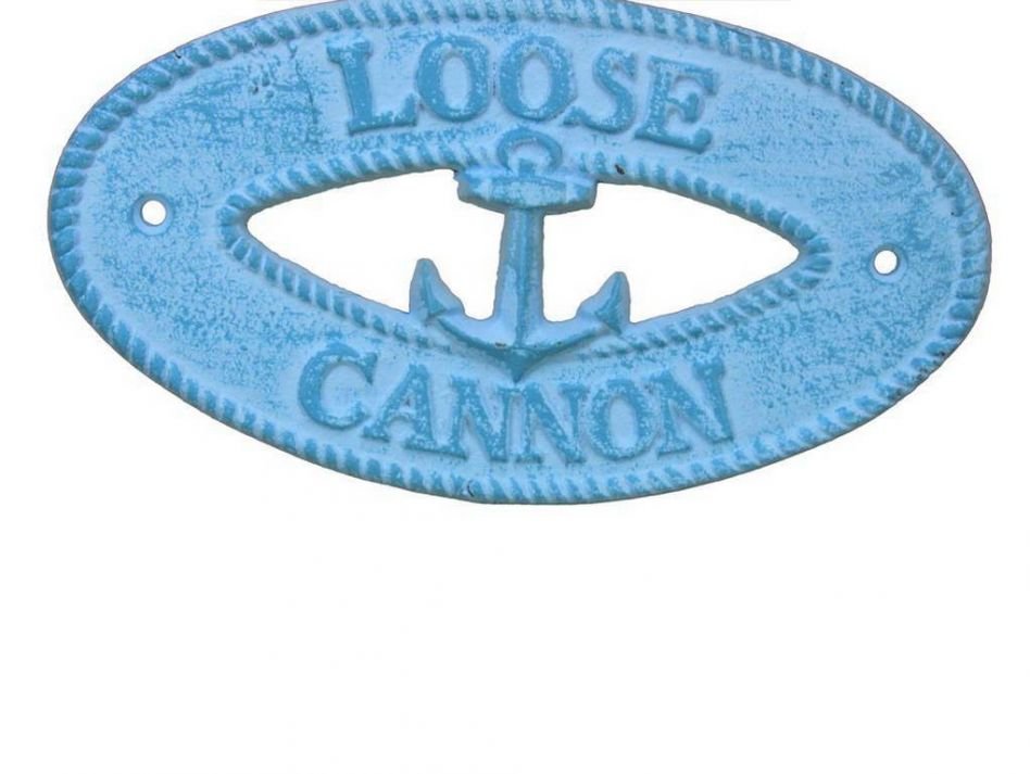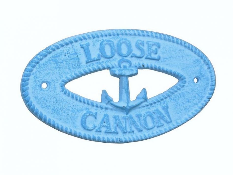 Ideal for posting in any nautical themed room, this brilliant "Light Blue Whitewashed Cast Iron Loose Cannon with Anchor Sign 8" clearly gets its point across. With a textured, rustic framing and body, this distinctive nautical metal wall art plaque is easily mountable. Display this nautical decor sign on your boat or in your nautical home and show your affinity for the sea-faring lifestyle to those who visit.