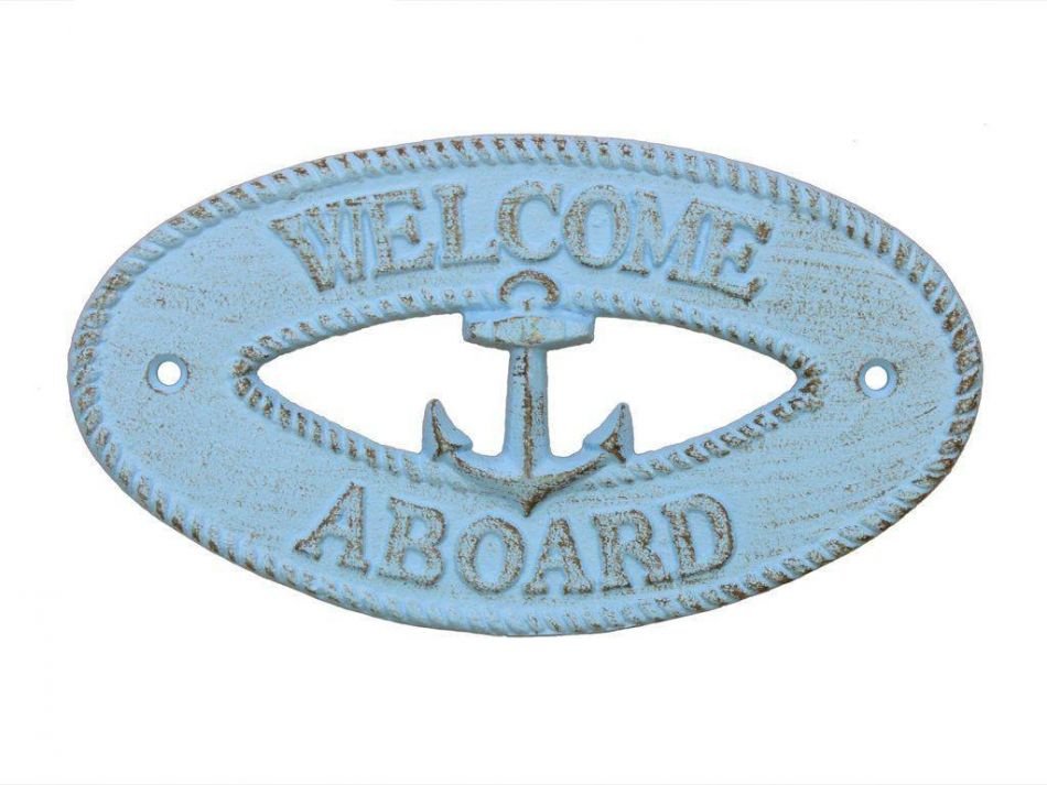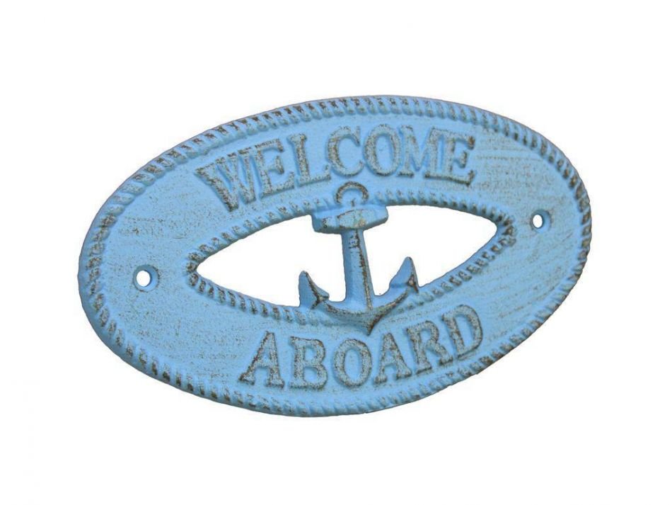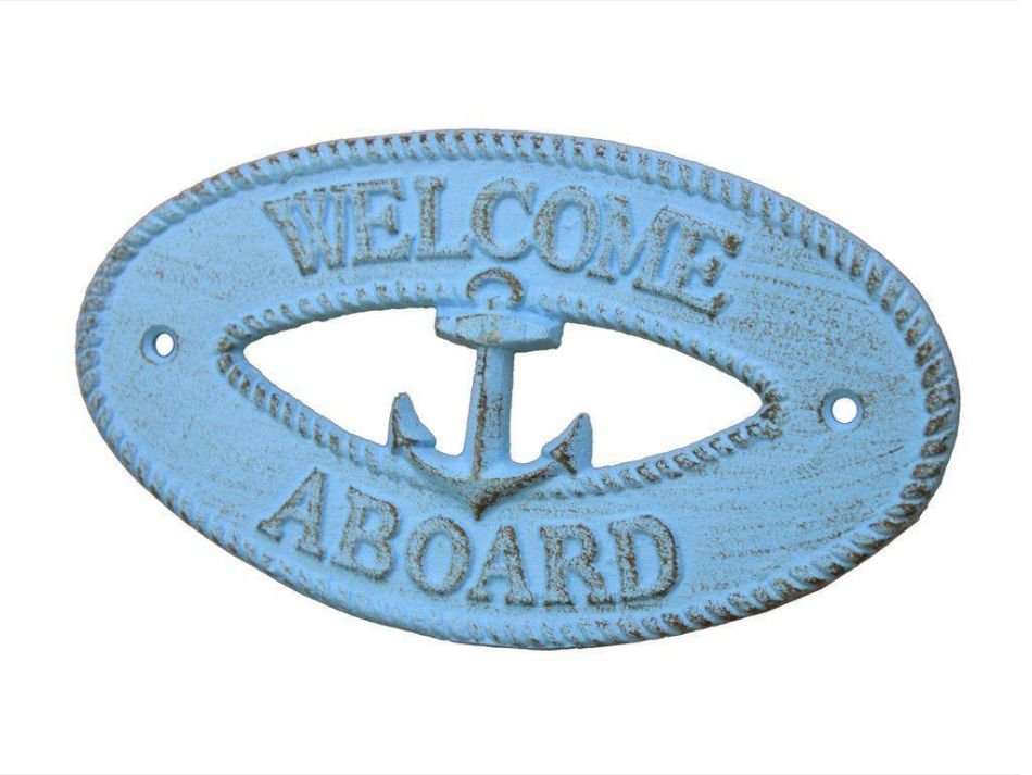 Rustic Light Blue Cast Iron Welcome Aboard with Anchor Sign 8"" Rustic Light Blue Cast Iron Welcome Aboard with Anchor Sign 8"" Rustic Light Blue Cast Iron Welcome Aboard with Anchor Sign 8""