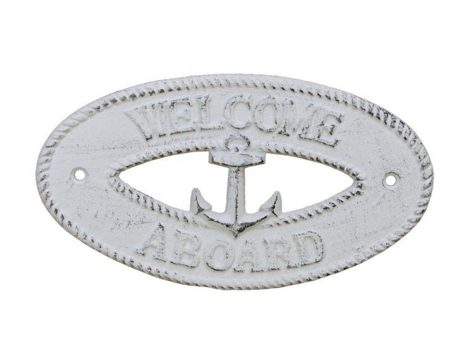 Whitewashed Cast Iron Welcome Aboard with Anchor Sign 8""