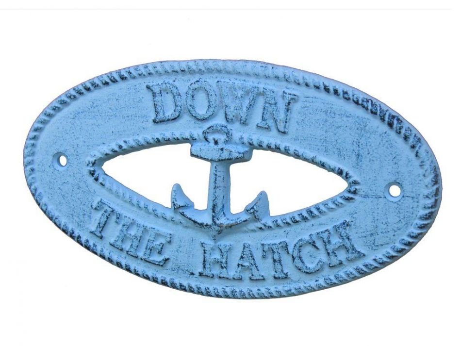 Dark Blue Whitewashed Cast Iron Down the Hatch with Anchor Sign 8"" Dark Blue Whitewashed Cast Iron Down the Hatch with Anchor Sign 8"" Dark Blue Whitewashed Cast Iron Down the Hatch with Anchor Sign 8""