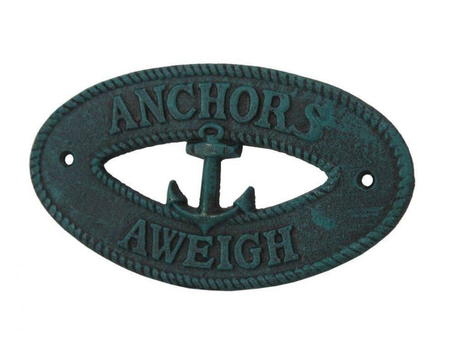 Seaworn Blue Cast Iron Anchors Aweigh with Anchor Sign 8""
