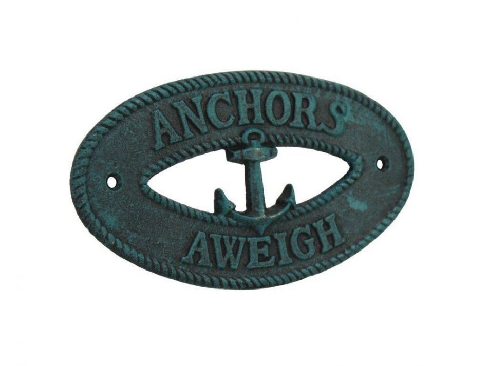 Ideal for posting in any nautical themed room, this brilliant "Seaworn Blue Cast Iron Anchors Aweigh with Anchor Sign 8" clearly gets its point across. With a textured, rustic framing and body, this distinctive nautical metal wall art plaque is easily mountable. Display this nautical decor sign on your boat or in your nautical home and show your affinity for the sea-faring lifestyle to those who visit.