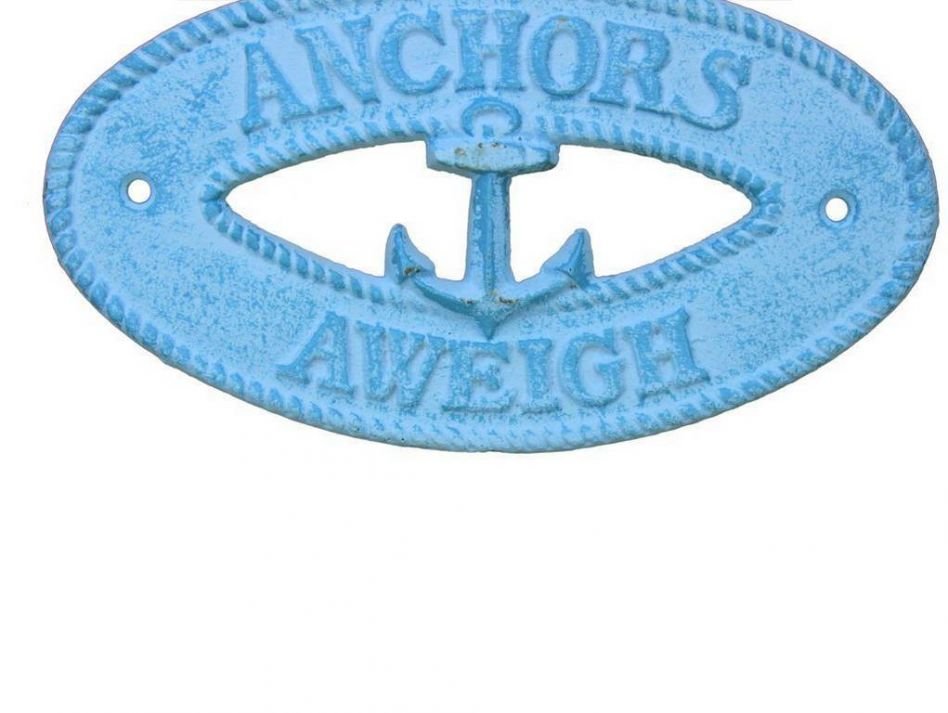 Light Blue Whitewashed Cast Iron Anchors Aweigh with Anchor Sign 8""