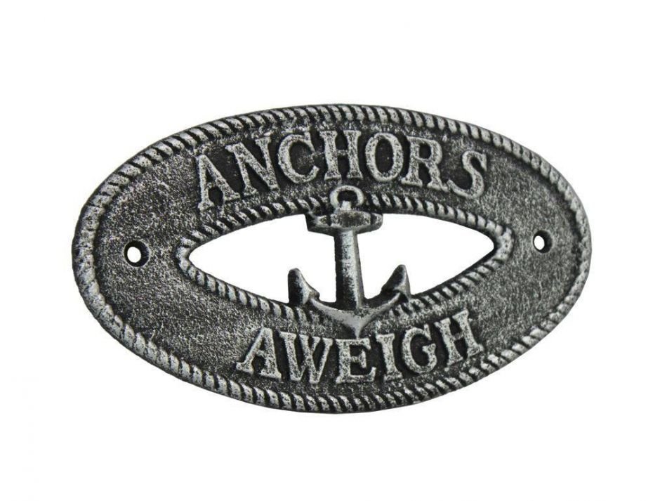 Antique Silver Cast Iron Anchors Aweigh with Anchor Sign 8""