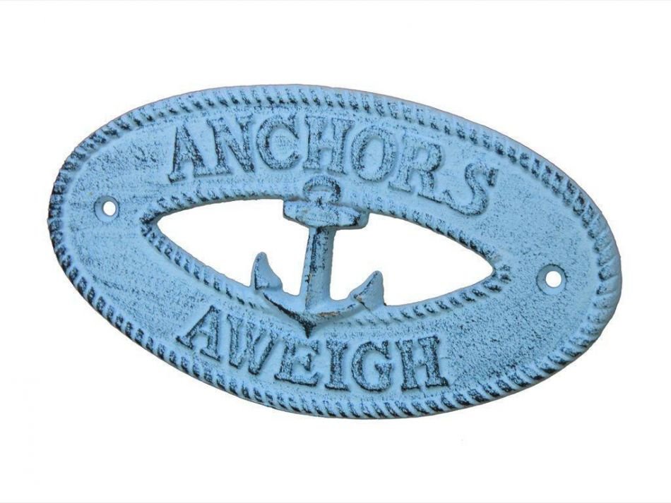 Dark Blue Whitewashed Cast Iron Anchors Aweigh with Anchor Sign 8""