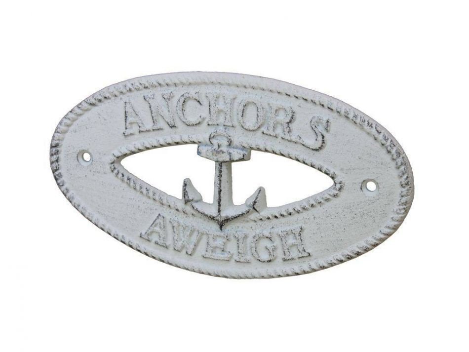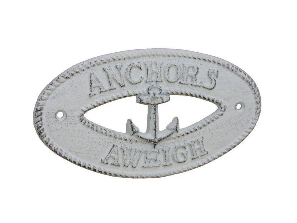 Ideal for posting in any nautical themed room, this brilliant "Whitewashed Cast Iron Anchors Aweigh with Anchor Sign 8" clearly gets its point across. With a textured, rustic framing and body, this distinctive nautical metal wall art plaque is easily mountable. Display this nautical decor sign on your boat or in your nautical home and show your affinity for the sea-faring lifestyle to those who visit.