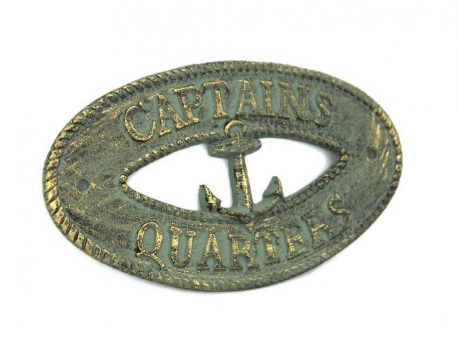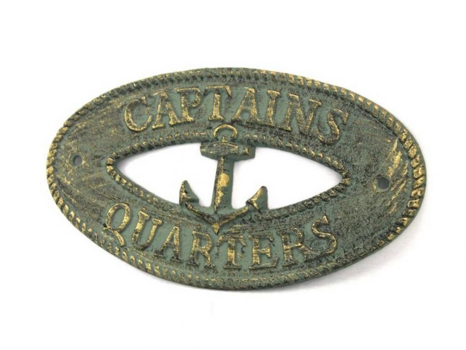 Ideal for posting in any nautical themed room, this brilliant "Antique Bronze Cast Iron Captains Quarters with Anchor Sign 8" clearly gets its point across. With a textured, rustic framing and body, this distinctive nautical metal wall art plaque is easily mountable. Display this nautical decor sign on your boat or in your nautical home and show your affinity for the sea-faring lifestyle to those who visit.