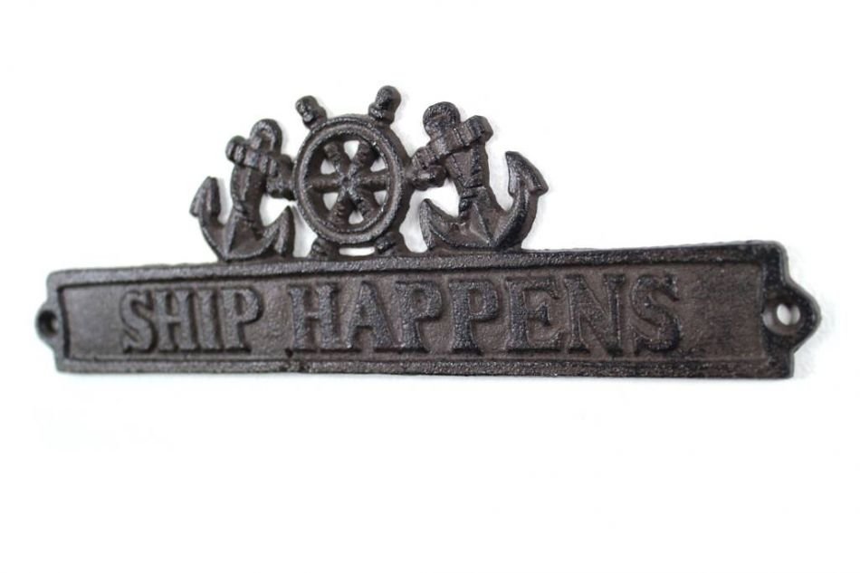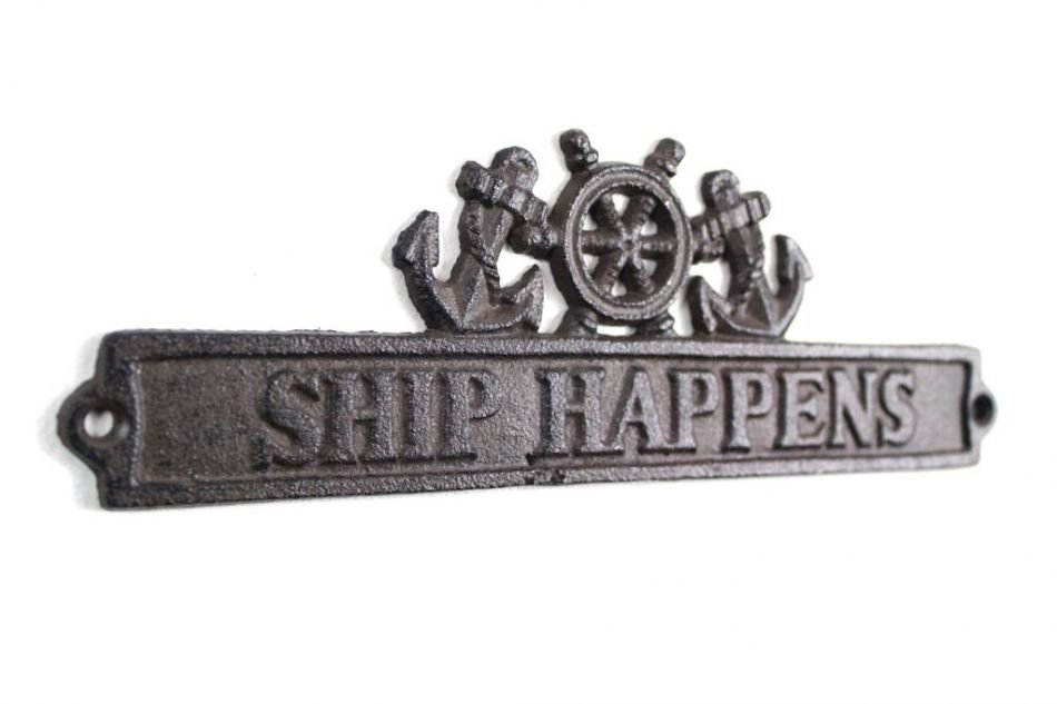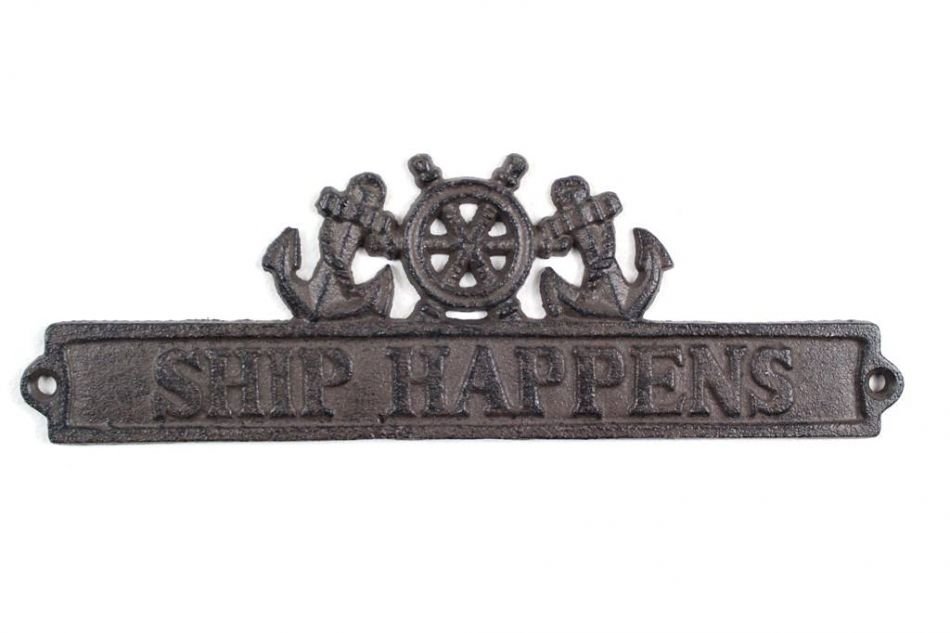 Ideal for posting in any nautical themed room, this brilliant "Cast Iron Ship Happens Sign with Ship Wheel and Anchors 9" clearly gets its point across. With a textured, rustic framing and body, this distinctive nautical metal wall art plaque is easily mountable. Display this nautical decor sign on your boat or in your nautical home and show your affinity for the sea-faring lifestyle to those who visit.