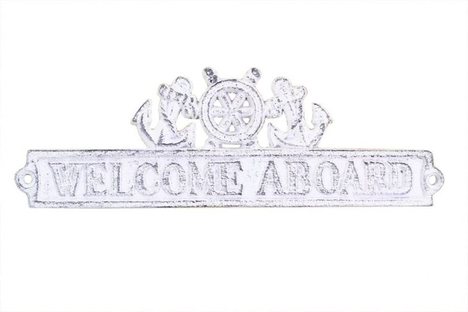 Ideal for posting in any nautical themed room, this brilliant "Whitewashed Cast Iron Welcome Aboard Sign with Ship Wheel and Anchors 9" clearly gets its point across. With a textured, rustic framing and body, this distinctive nautical metal wall art plaque is easily mountable. Display this nautical decor sign on your boat or in your nautical home and show your affinity for the sea-faring lifestyle to those who visit.