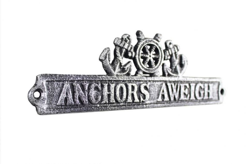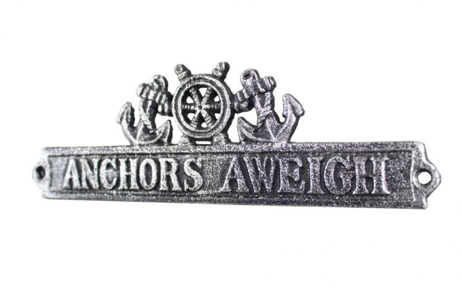 Ideal for posting in any nautical themed room, this brilliant "Antique Silver Cast Iron Anchors Aweigh Sign with Ship Wheel and Anchors 9" clearly gets its point across. With a textured, rustic framing and body, this distinctive nautical metal wall art plaque is easily mountable. Display this nautical decor sign on your boat or in your nautical home and show your affinity for the sea-faring lifestyle to those who visit.