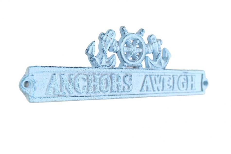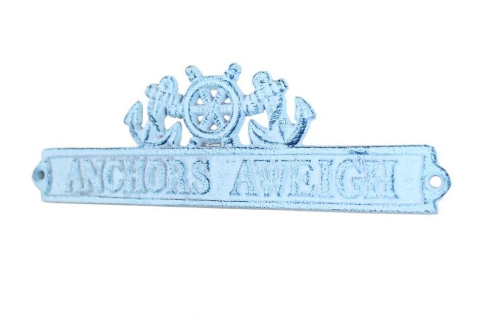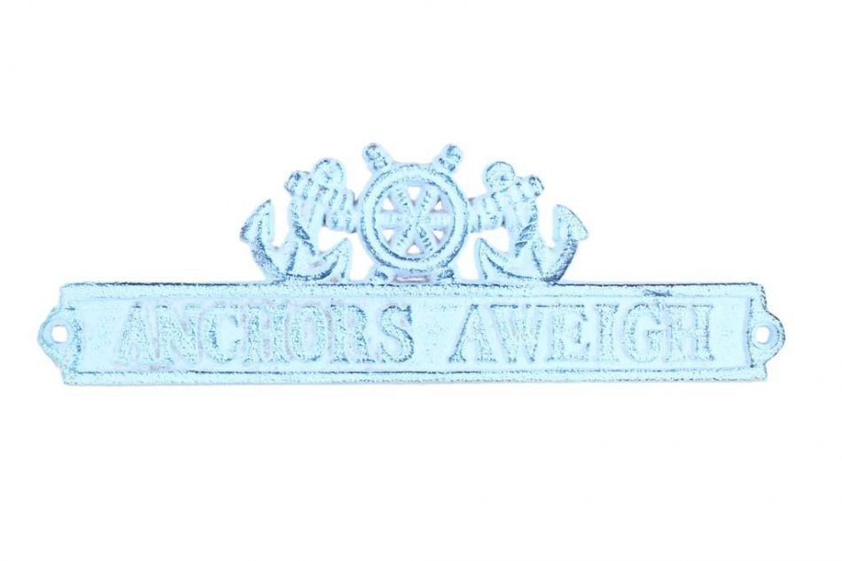 Ideal for posting in any nautical themed room, this brilliant "Dark Blue Whitewashed Cast Iron Anchors Aweigh Sign with Ship Wheel and Anchors 9" clearly gets its point across. With a textured, rustic framing and body, this distinctive nautical metal wall art plaque is easily mountable. Display this nautical decor sign on your boat or in your nautical home and show your affinity for the sea-faring lifestyle to those who visit.