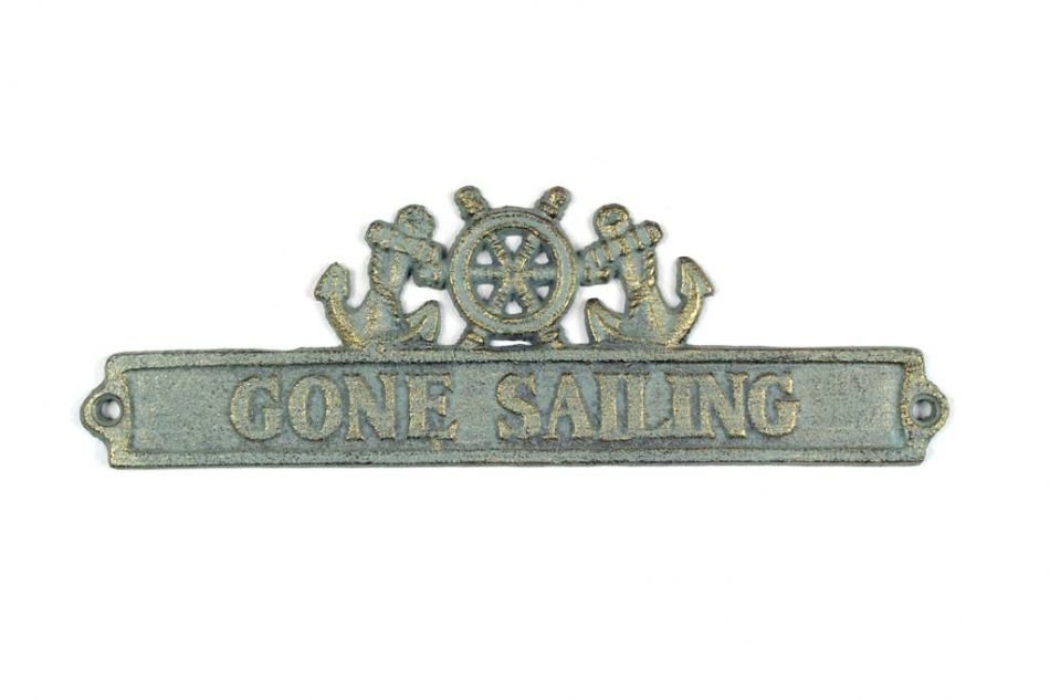 Ideal for posting in any nautical themed room, this brilliant "Antique Bronze Cast Iron Gone Sailing Sign with Ship Wheel and Anchors 9" clearly gets its point across. With a textured, rustic framing and body, this distinctive nautical metal wall art plaque is easily mountable. Display this nautical decor sign on your boat or in your nautical home and show your affinity for the sea-faring lifestyle to those who visit.