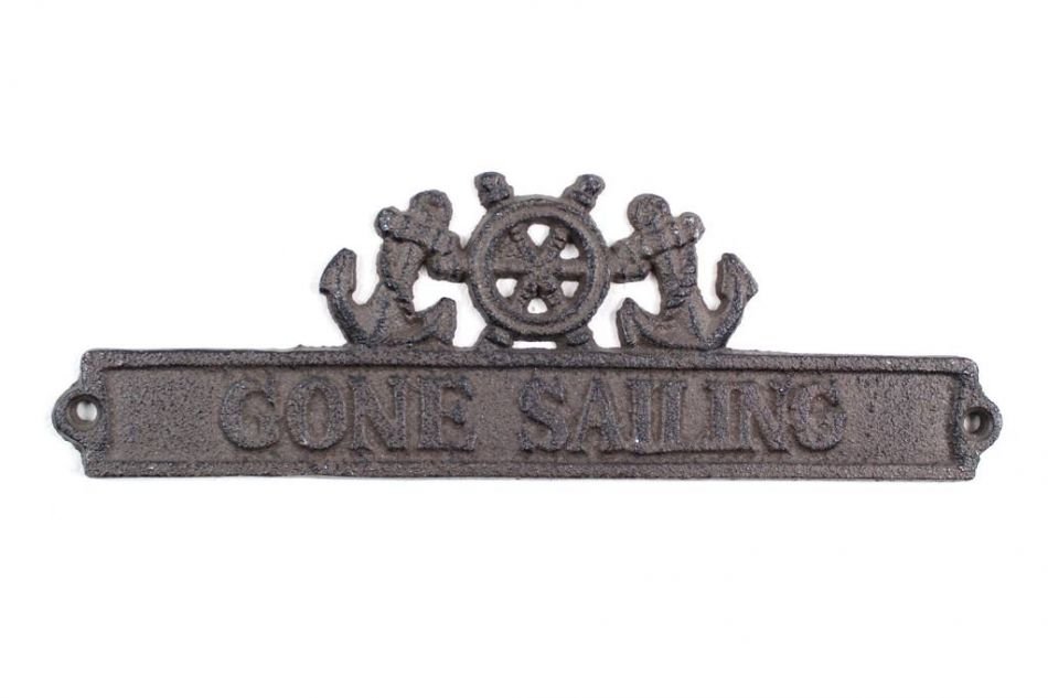 Ideal for posting in any nautical themed room, this brilliant "Cast Iron Gone Sailing Sign with Ship Wheel and Anchors 9" clearly gets its point across. With a textured, rustic framing and body, this distinctive nautical metal wall art plaque is easily mountable. Display this nautical decor sign on your boat or in your nautical home and show your affinity for the sea-faring lifestyle to those who visit.