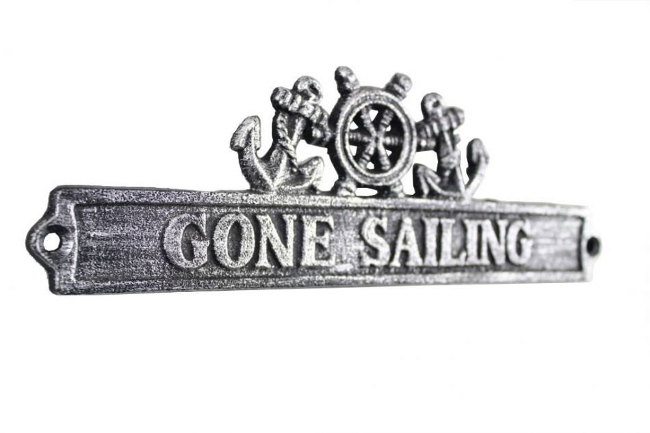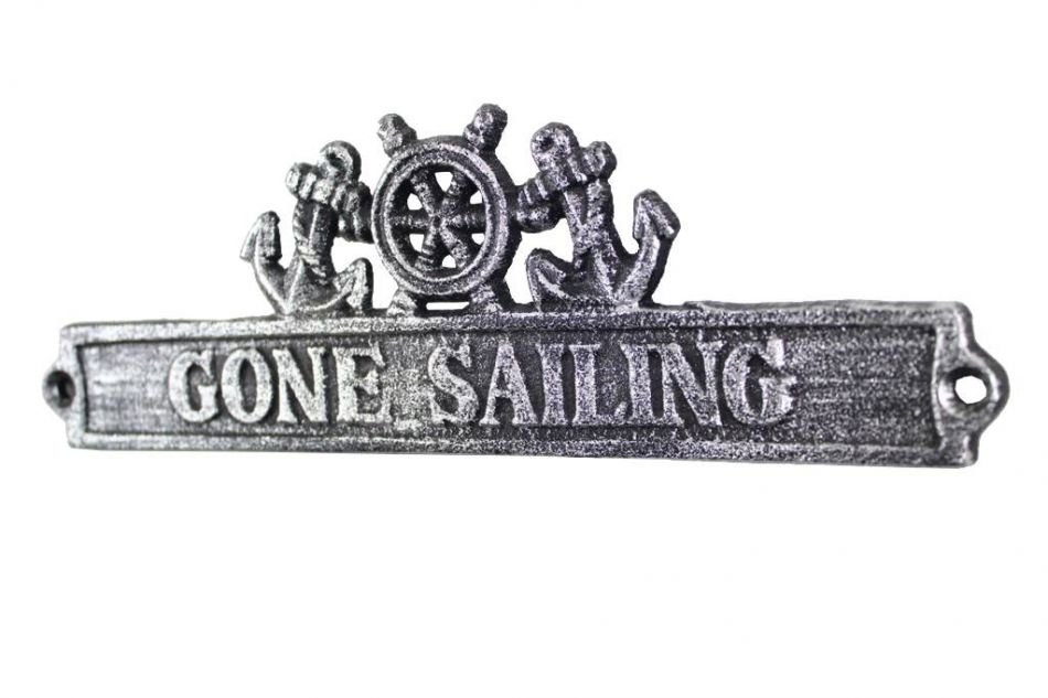Ideal for posting in any nautical themed room, this brilliant "Antique Silver Cast Iron Gone Sailing Sign with Ship Wheel and Anchors 9" clearly gets its point across. With a textured, rustic framing and body, this distinctive nautical metal wall art plaque is easily mountable. Display this nautical decor sign on your boat or in your nautical home and show your affinity for the sea-faring lifestyle to those who visit.