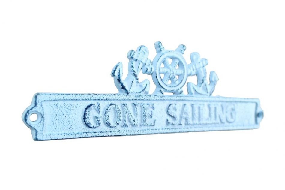 Dark Blue Whitewashed Cast Iron Gone Sailing Sign with Ship Wheel and Anchors 9"" Dark Blue Whitewashed Cast Iron Gone Sailing Sign with Ship Wheel and Anchors 9"" Dark Blue Whitewashed Cast Iron Gone Sailing Sign with Ship Wheel and Anchors 9""