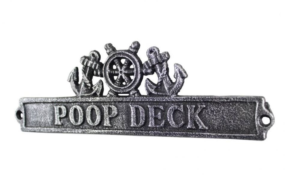 Ideal for posting in any nautical themed room, this brilliant "Antique Silver Cast Iron Poop Deck Sign with Ship Wheel and Anchors 9" clearly gets its point across. With a textured, rustic framing and body, this distinctive nautical metal wall art plaque is easily mountable. Display this nautical decor sign on your boat or in your nautical home and show your affinity for the sea-faring lifestyle to those who visit.