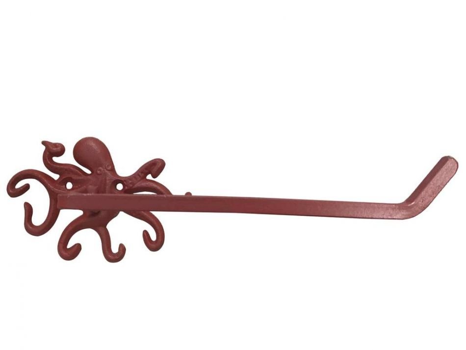 This Rustic Red Cast Iron Octopus Toilet Paper Holder 11" is perfect for any nautical inspired bathroom. It adds charm to any nautical room, while impressing your guests with their substance and thoughtfulness. Ideal for hanging toilet paper, this durable toilet paper holder 11" is crafted from cast iron. Easily mountable, display this decorative holder to show those who visit your home the affinity for the sea-faring lifestyle.