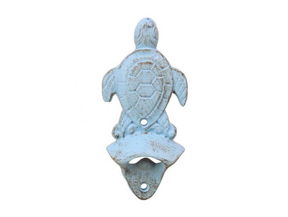 The Rustic Light Blue Cast Iron Wall Mounted Sea Turtle Bottle Opener 6" perfectly accents any nautical themed kitchen or bar. Crafted from cast iron rustic finish, this heavy bottle opener will open even the most difficult of bottles with ease.