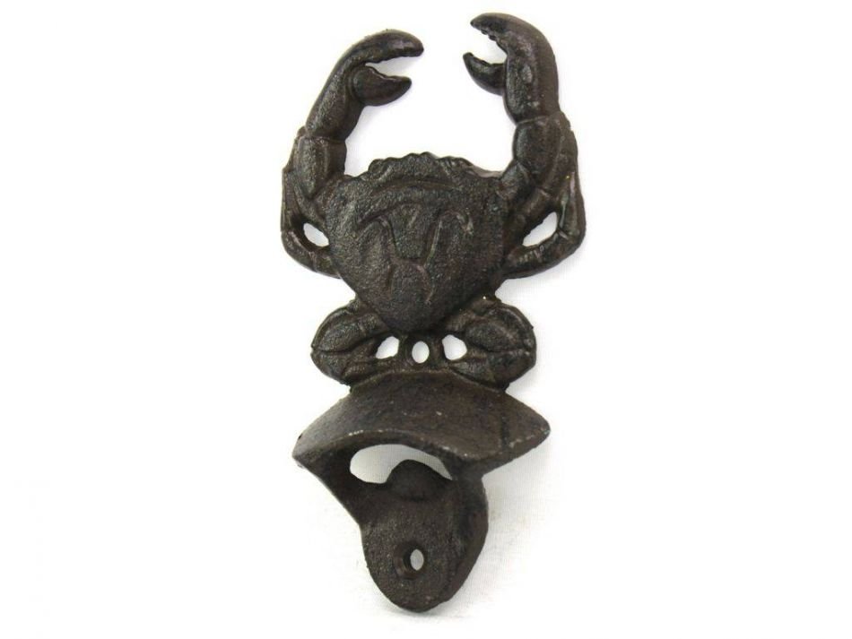 The Cast Iron Wall Mounted Crab Bottle Opener 6" perfectly accents any nautical themed kitchen or bar. Crafted from cast iron rustic finish, this heavy bottle opener will open even the most difficult of bottles with ease.