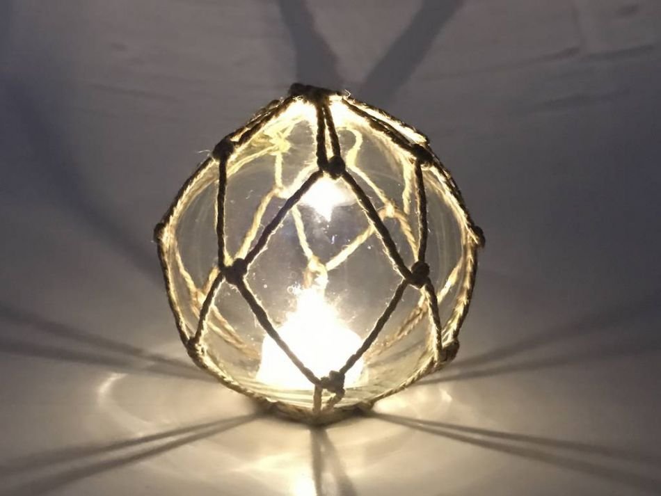 Tabletop LED Lighted Clear Japanese Glass Ball Fishing Float with Brown Netting Decoration 4""